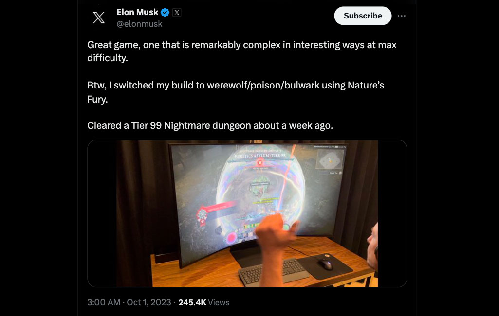 埃隆·马斯克在周日深夜直播了自己玩一个暗黑破坏神IV地牢,以测试他的社交网络处理游戏直播的能力。