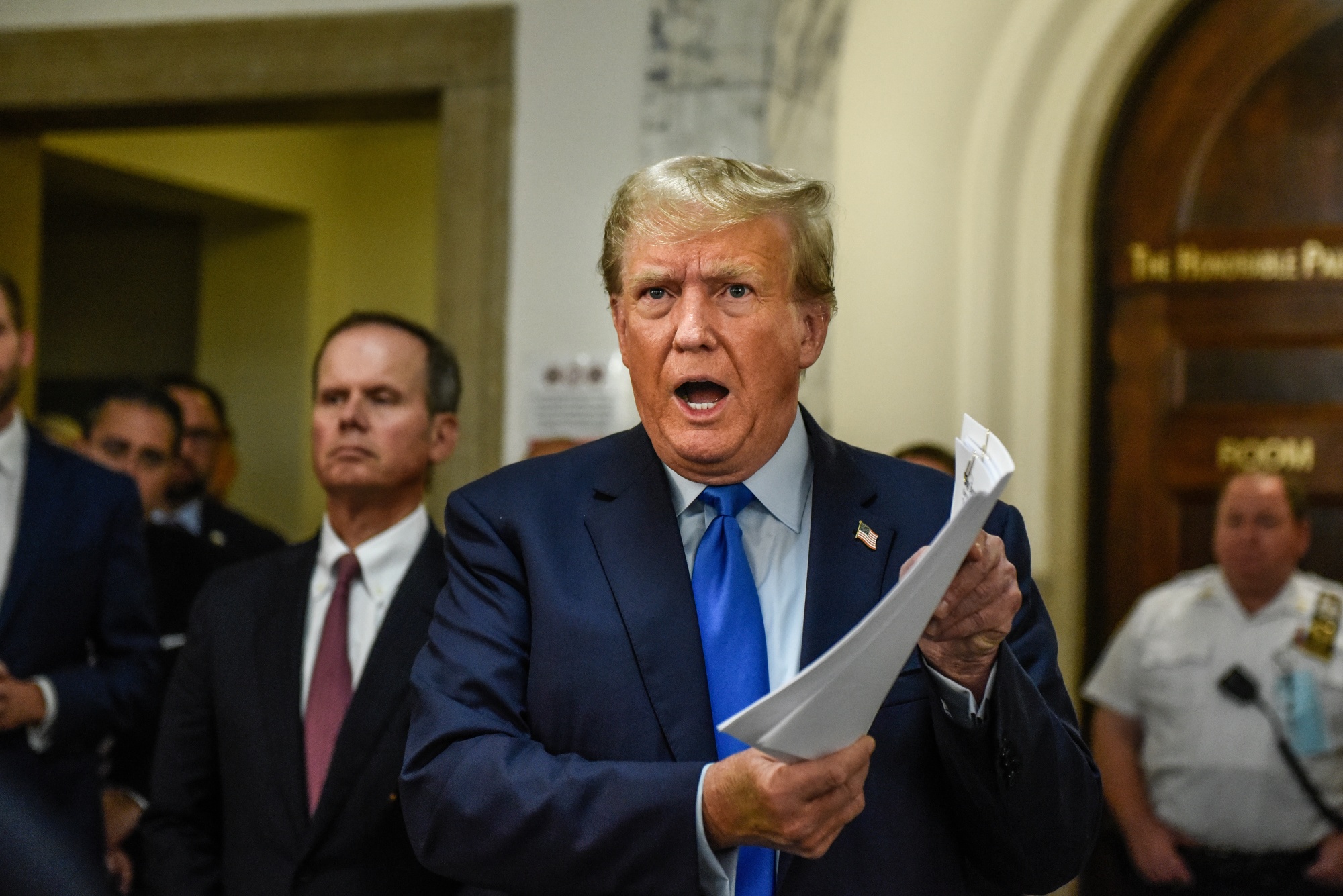 前美国总统唐纳德·特朗普在2023年10月2日星期一在纽约州最高法院向媒体发表讲话。摄影师:斯蒂芬妮·基思/彭博社当他在休息时离开时,特朗普告诉法庭外的记者法官应该被“吊销执照”。