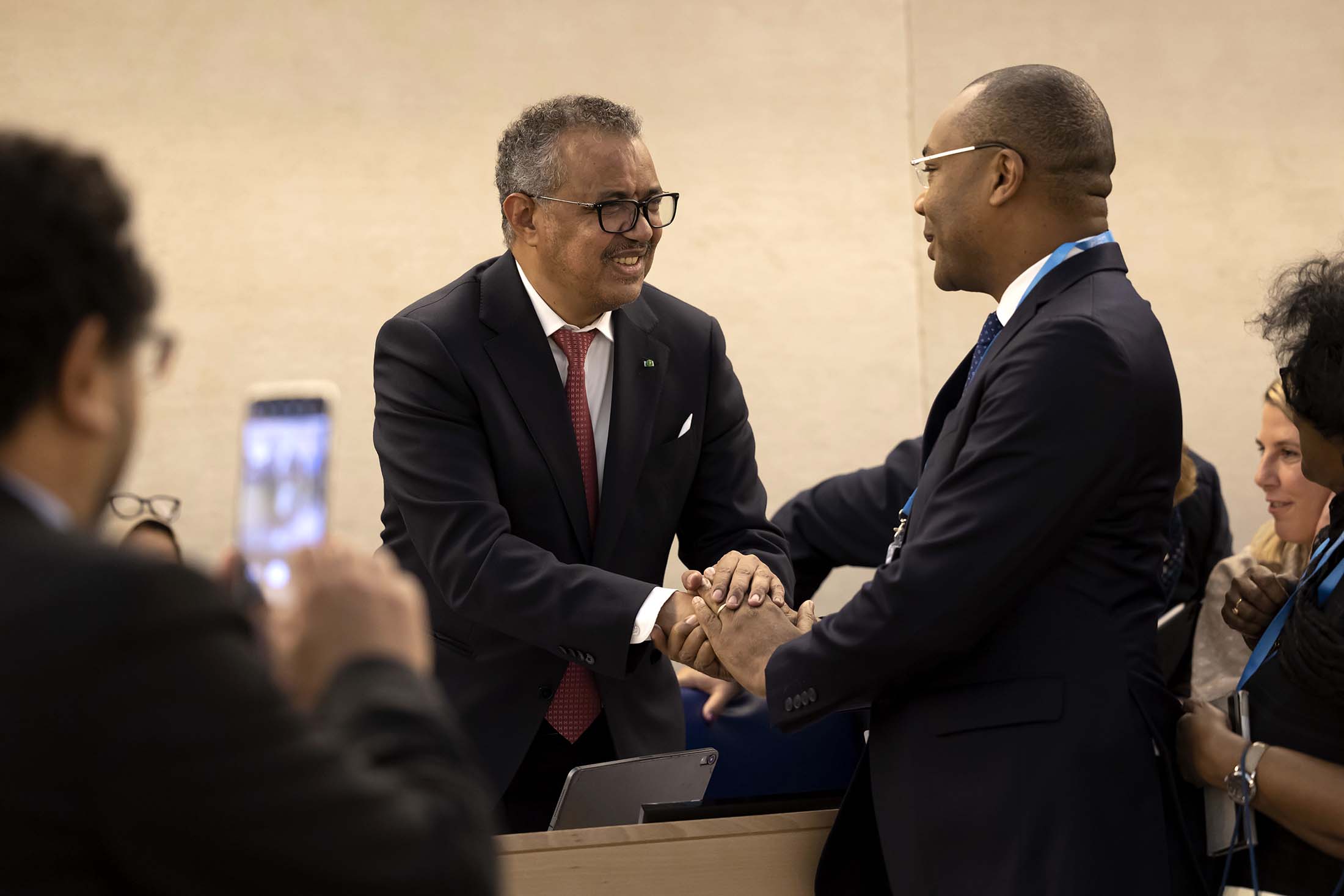 特德罗斯在2022年世界卫生大会上当选为世卫组织负责人后,受到日内瓦代表团的祝贺。摄影师:Salvatore Di Nolfi/Keystone/AP彭博社在接触特德罗斯之前看到了这些文件,特德罗斯表示他不知道埃塞俄比亚对他进行了刑事诉讼。他同意谈论他和家人所受到的压力,但表示不想破坏政府和TPLF去年11月达成的和平协议的努力。