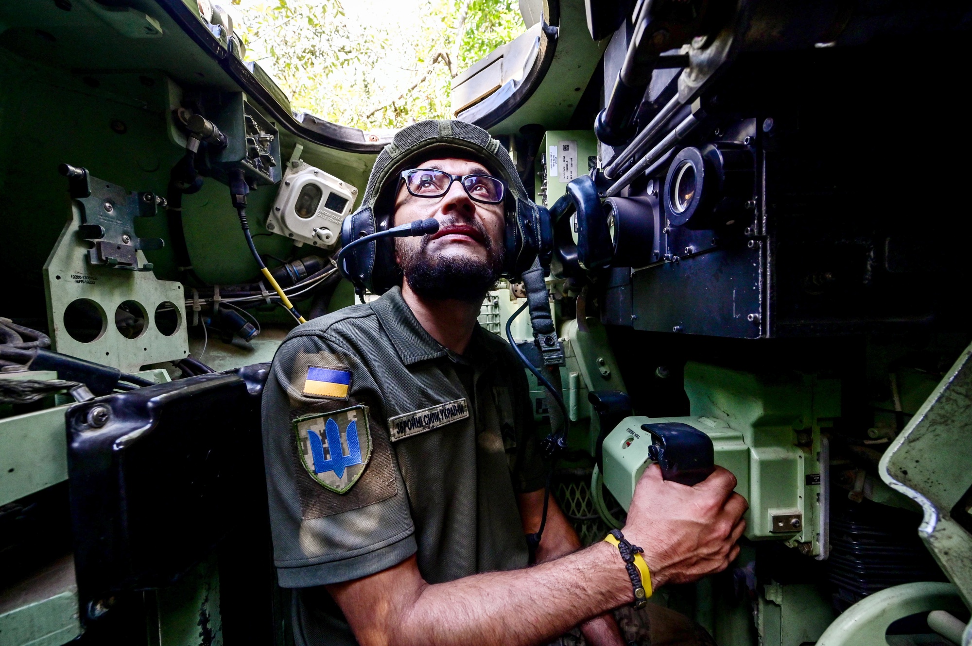 在乌克兰扎波罗热地区,一名布拉德利步兵战车的车组成员,2023年9月。