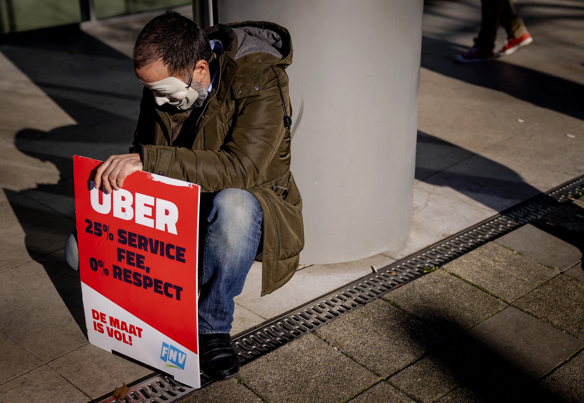 在二月份,一名抗议者在阿姆斯特丹的优步总部举行的示威活动中。