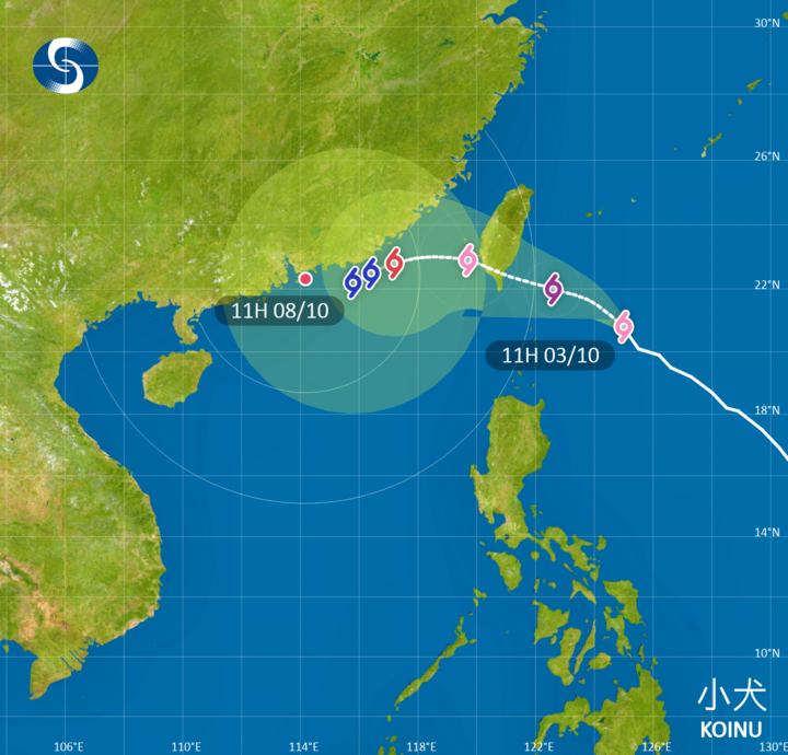 10月3日的台风Koinu。来源:RAMMB/CIRA据地区气象台称,台风Koinu将在未来几天内经过台湾南端,然后前往香港,但强度会减弱。