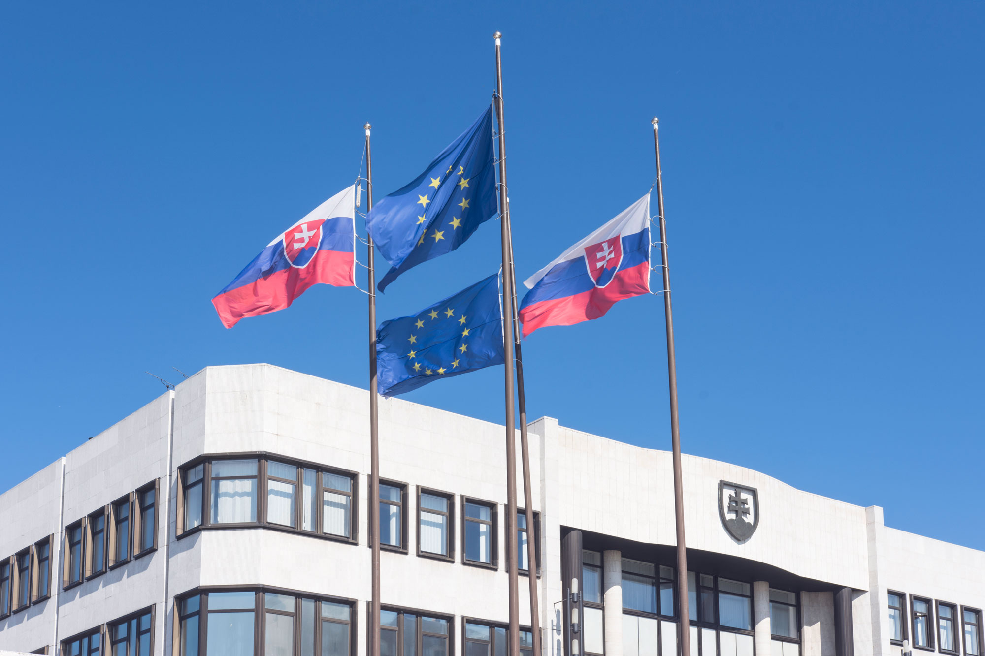 布拉迪斯拉发议会外的欧洲和斯洛伐克国旗。