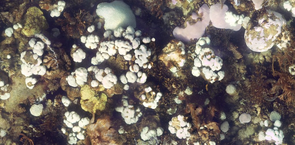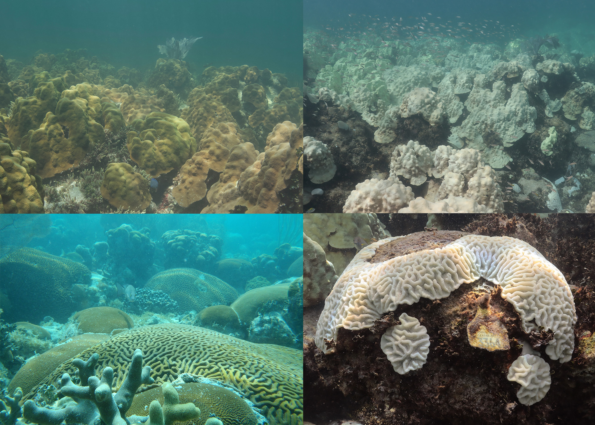 建造珊瑚礁的珊瑚与藻类有共生关系,藻类生活在珊瑚礁结构上,赋予珊瑚颜色的同时也提供珊瑚大部分的食物和能量。然而,当水温升高时,同样的藻类会伤害珊瑚,珊瑚会将其排出,这个过程被称为漂白(藻类离开后,颜色也消失)。漂白的珊瑚进入饥饿期,如果不加以控制,最终会导致死亡。