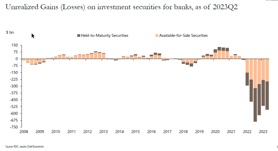 然而,由于利率上升导致的地区银行的纸面损失将进一步限制信贷。Apollo Global首席经济学家Torsten Slok最近的一份演示文稿中的幻灯片显示,尽管这些损失在几个季度后有所减少,但现在又再次增加。随着长期利率的上升,这些损失将进一步增加。