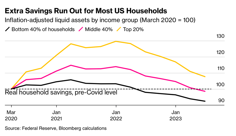 随着通货膨胀、租金上涨和利率提高在2022年初出现,最底层40%的家庭已经用完了钱。但今年,中间40%的家庭也发生了同样的情况,而前20%的额外疫情储蓄也在紧随其后地下降。由于高收入家庭通常更倾向于储蓄,消费支出的支持似乎已经或多或少消失了。