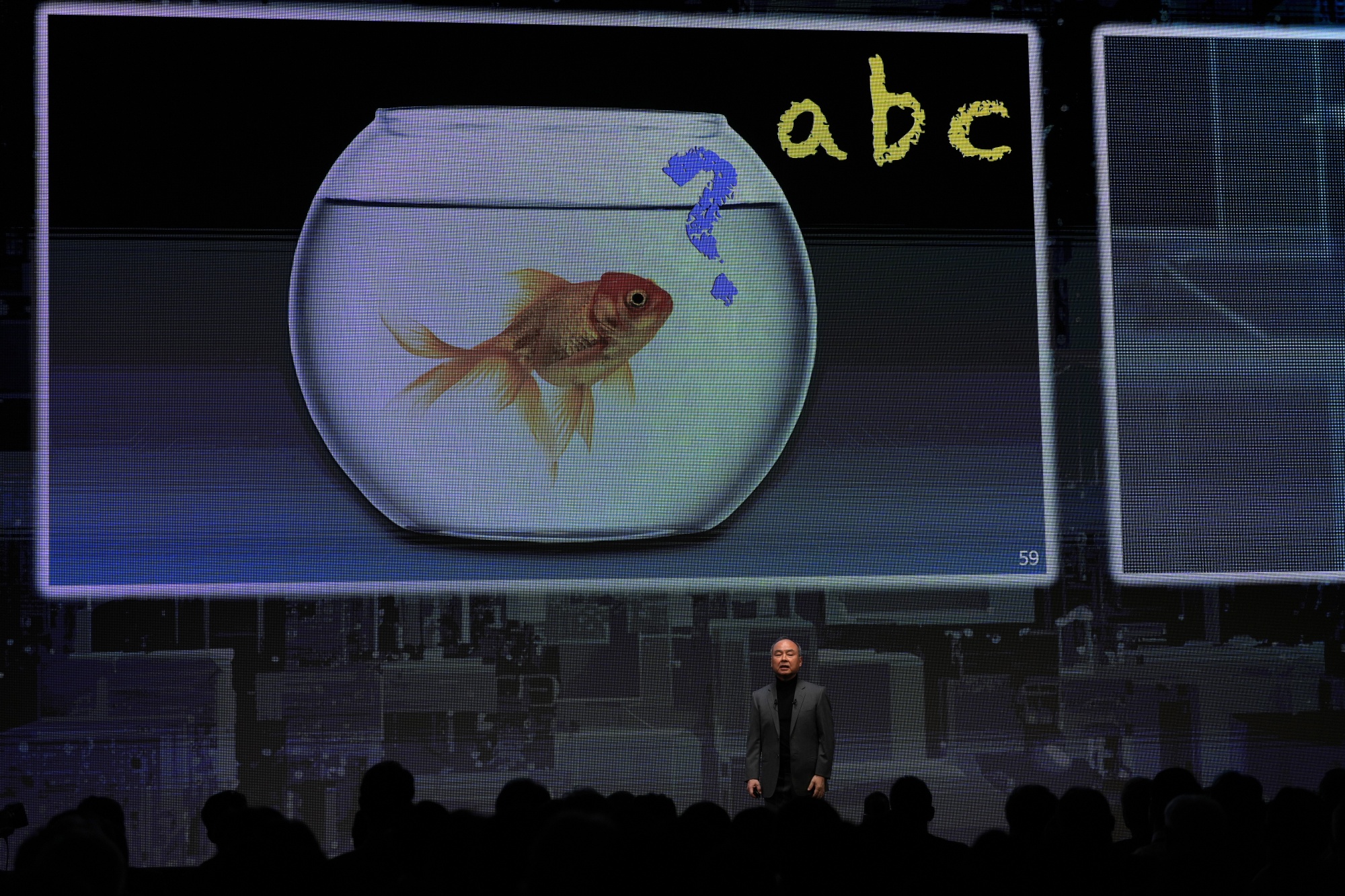 儿子在他为期90分钟的演讲中展示了对人工智能的热情,演讲以一个鱼缸里的金鱼的插图开始。他说,拒绝使用人工智能的人最终会像那只金鱼一样,无法处理像语言这样的信息。他补充说,人工智能将掌握的知识总量将在十年内是人类总和的十倍。