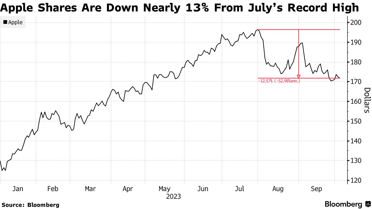 苹果股价今年仍上涨33%,但自7月创下纪录高位以来已回落近13%,受到科技股抛售的影响,原因是担心高利率。上个月对新iPhone型号的发布并没有多大帮助重新点燃股市。周三股价下跌。