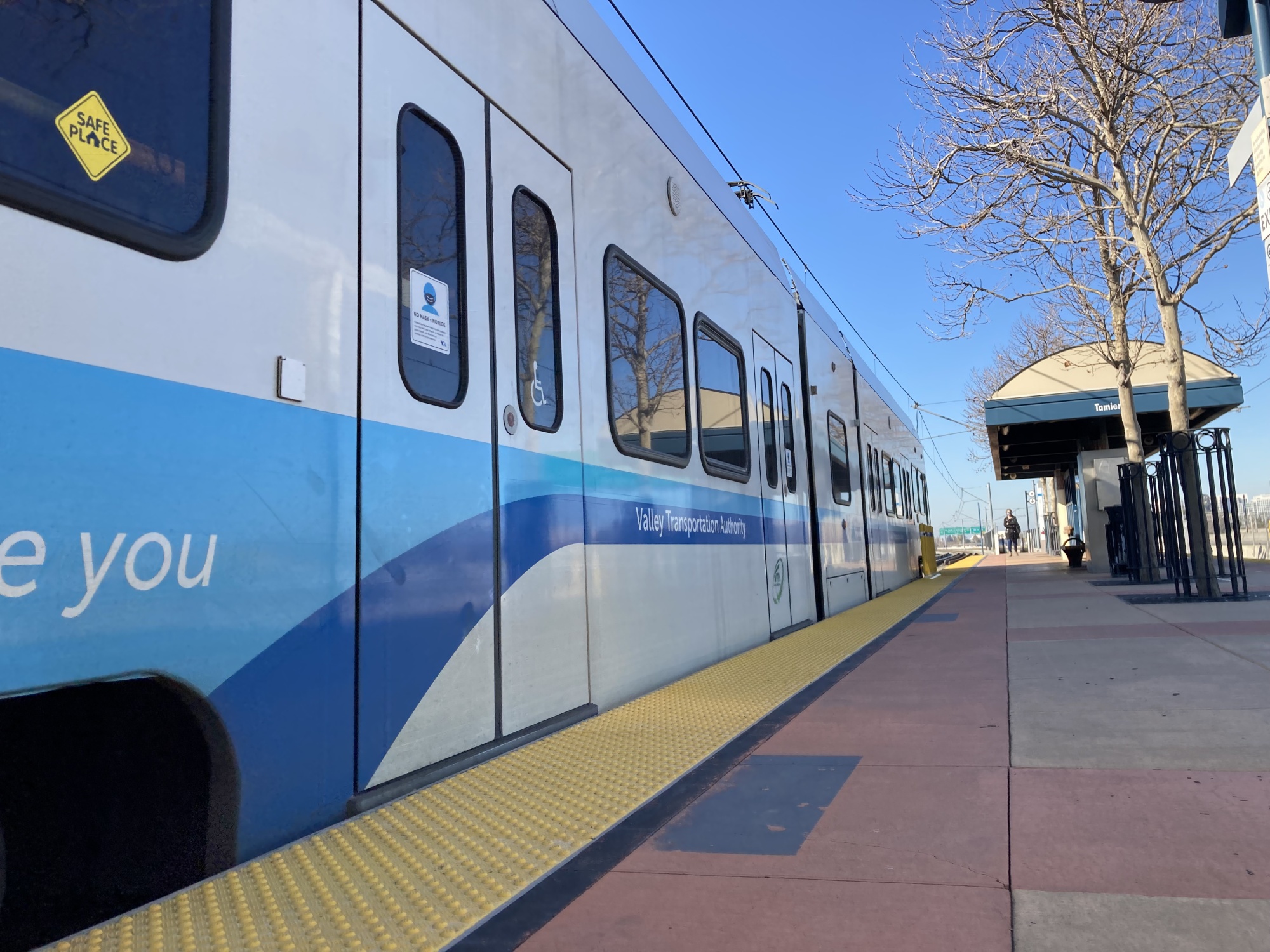 圣克拉拉谷交通管理局的一辆火车驶入车站。