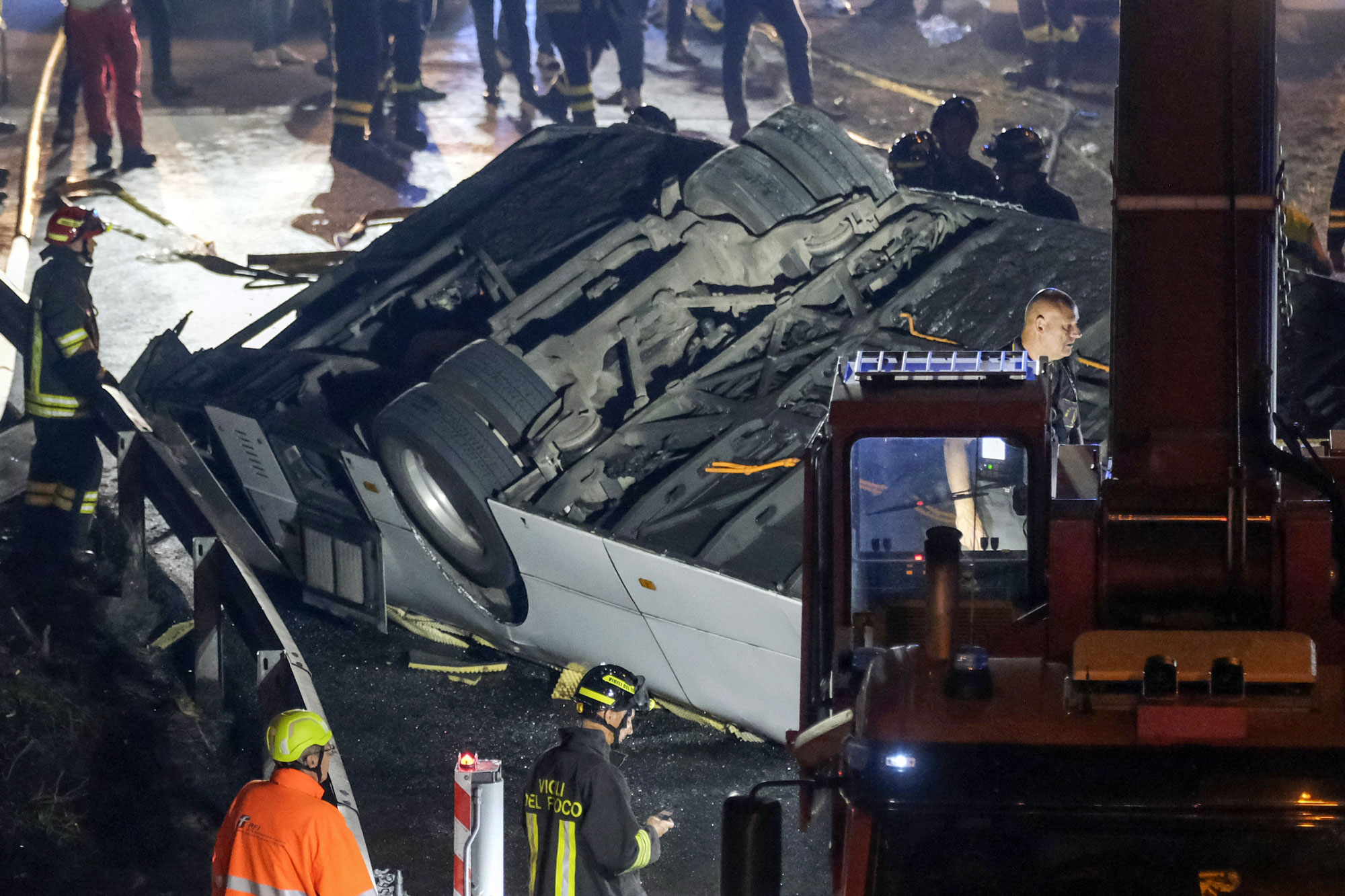 周二晚上,在威尼斯对面大陆的Mestre火车站附近的高架桥上,一辆载有来自乌克兰和其他几个国家的游客的旅游巴士坠落后起火。两名儿童在死者之列。