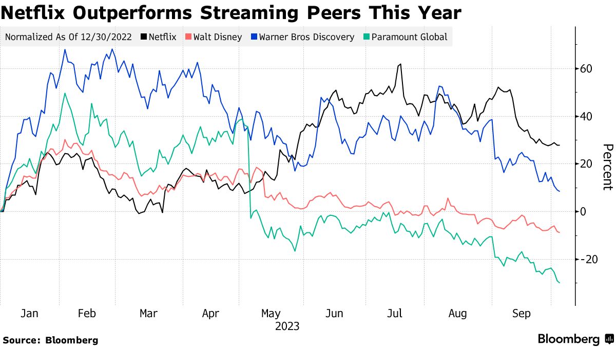 随着财报季即将结束,Netflix公司的年初至今股价表现超过视频流媒体同行,涨幅达27%。Warner Bros Discovery公司以8%的涨幅位列第二,而华特迪士尼公司和派拉蒙环球公司在同一时期均下跌。