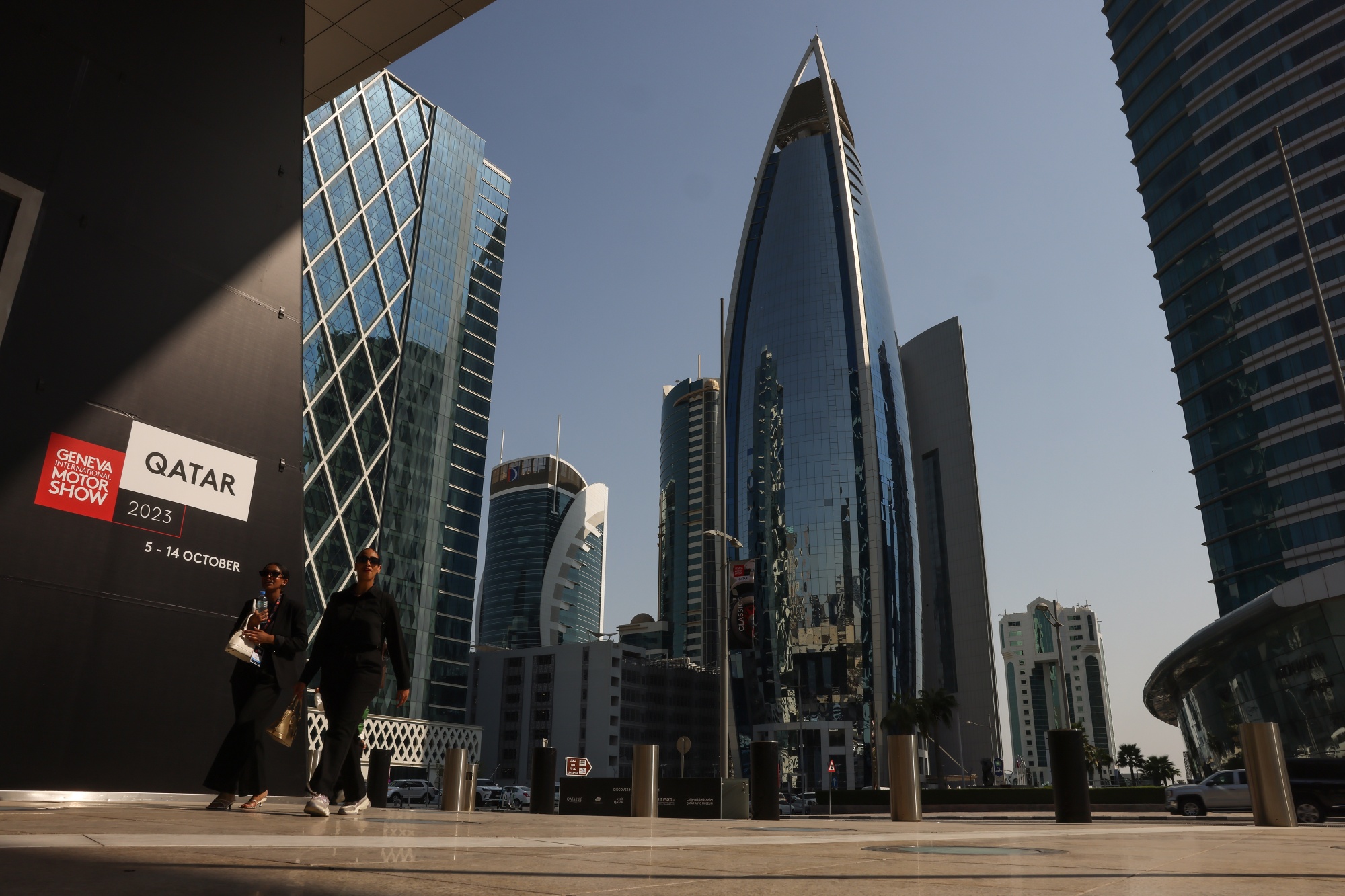 从多哈展览和会议中心外部看到的Woqod Tower摩天大楼,这里是日内瓦国际车展在多哈举行的场地,日期为10月4日。摄影师:Christopher Pike/Bloomberg闪闪发光的摩天大楼,沙漠背景和40摄氏度(104华氏度)的高温——这不是你通常在日内瓦国际车展上期待的,但这是今年活动的背景,因为它转移到了卡塔尔首都多哈。