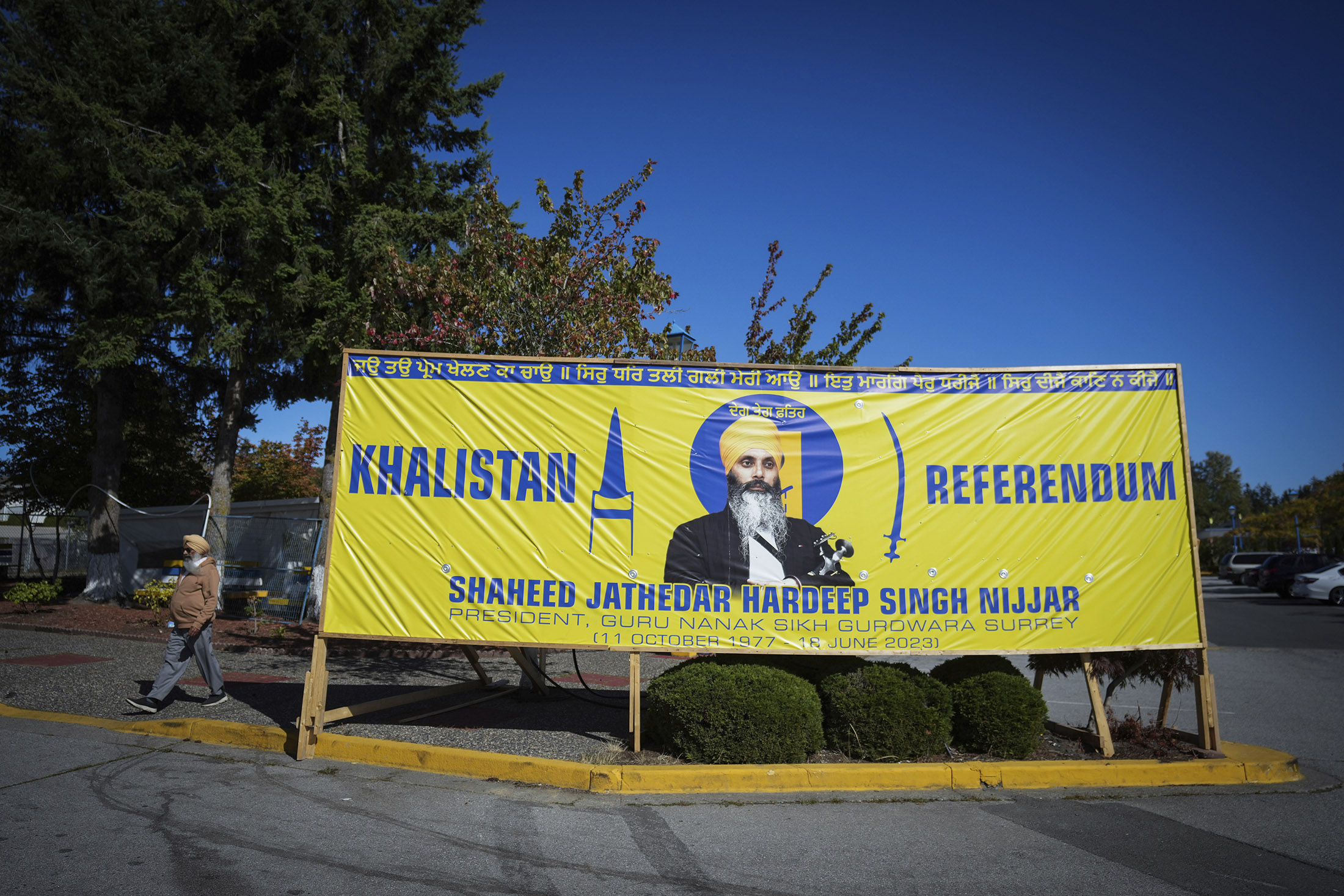 尼加尔的横幅挂在不列颠哥伦比亚省萨里的古鲁纳纳克锡克古德瓦拉(Guru Nanak Sikh Gurdwara Sahib)外。摄影师:达里尔·戴克(Darryl Dyck)/加拿大新闻社/美联社加拿大皇家骑警(RCMP)的官员与一辆救护车一同抵达。随后他们清理了聚集在古尔瓦拉外的人群,并用黄色警戒线封锁了该区域。他们展开了一项调查,到了九月底,这一事件爆发成全球头条新闻。加拿大总理贾斯汀·特鲁多指责印度特工参与了谋杀尼加尔的行动——尼加尔是一名为在旁遮普邦建立“哈利斯坦”(一个独立的锡克教家园)而奋斗的加拿大公民。印度总理纳伦德拉·莫迪政府称这一指控“荒谬”,并表示加拿大庇护了他们认为是恐怖分子的锡克教人物。莫迪政府还指责这些人物在印度境内煽动暴力事件。