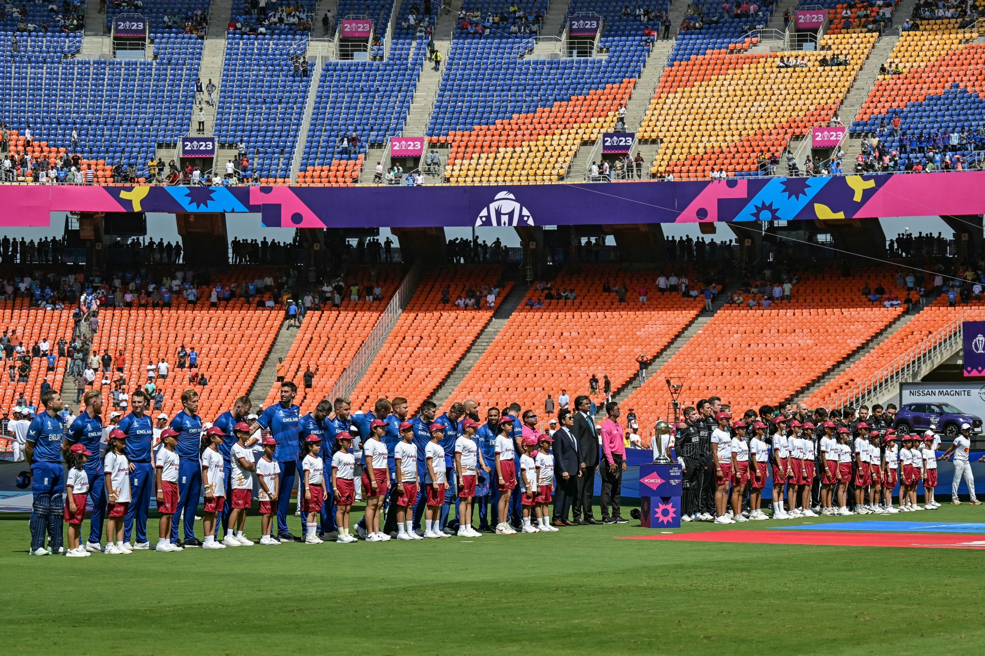 世界杯是印度总理纳伦德拉·莫迪提升他的家乡古吉拉特邦和体育场知名度的机会,该体育场在两年前突然更名。第一场比赛将看到卫冕冠军英格兰队迎战新西兰队,而长期对手巴基斯坦队将于10月14日在同一场馆对阵东道主印度队,该体育场还将是11月19日决赛和闭幕式的举办地。