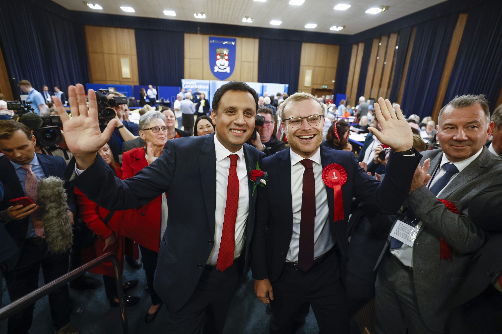 迈克尔·尚克斯(Michael Shanks)(右)和阿纳斯·萨瓦尔(Anas Sarwar)于10月6日抵达汉密尔顿(Hamilton)的鲁瑟格伦和汉密尔顿西部(Rutherglen and Hamilton West)补选计票站。