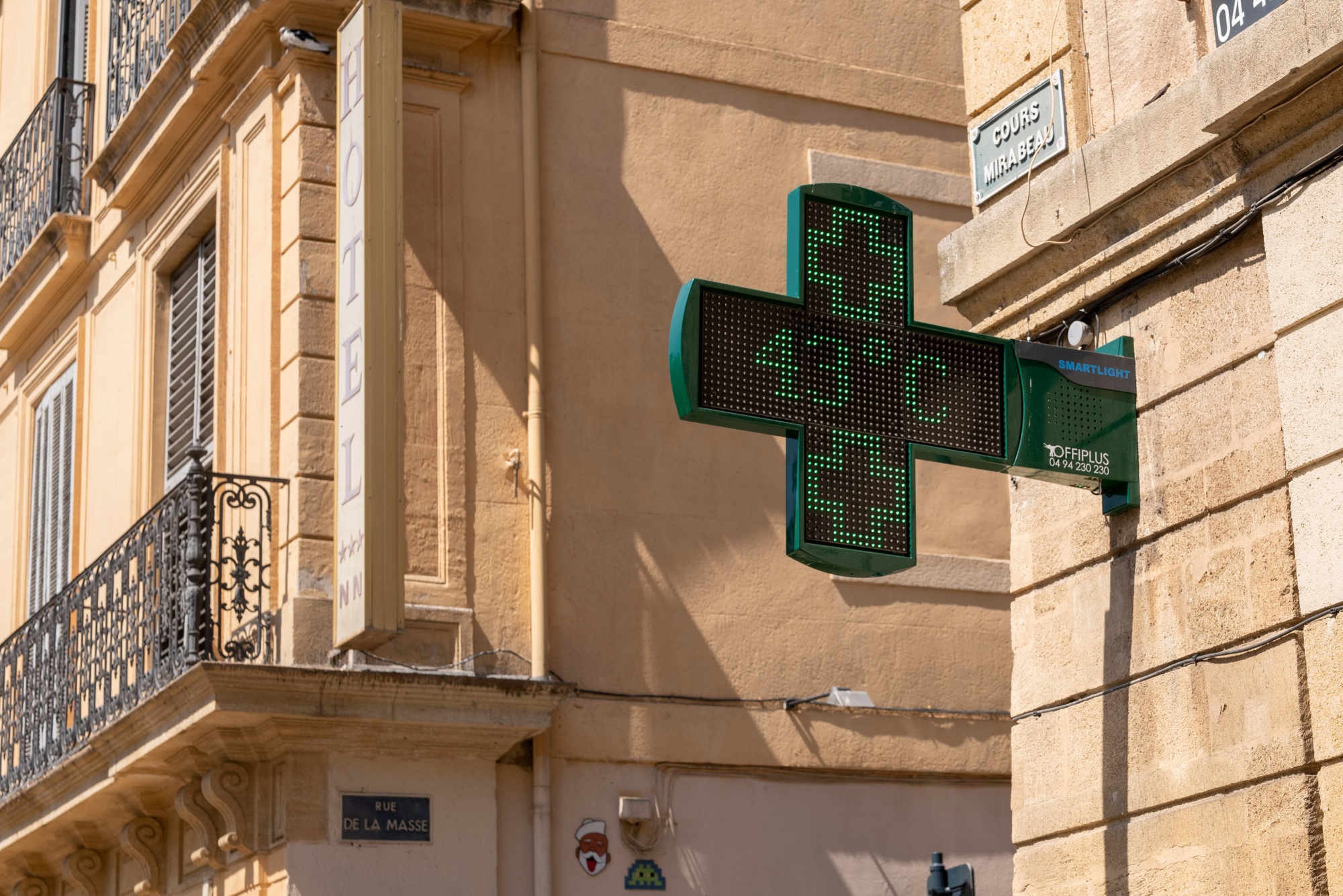 数字屏幕显示法国艾克斯省的一家药店外气温为摄氏43度,日期为2023年8月24日。