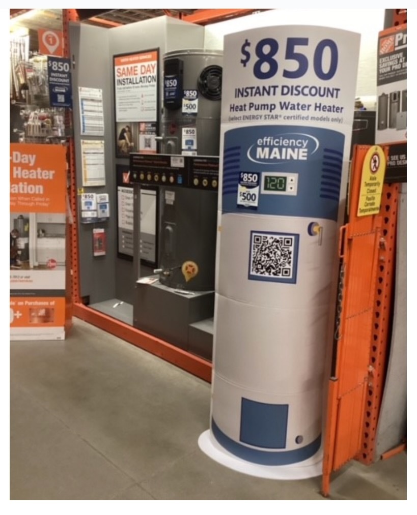 家得宝的 Efficiency Maine 热泵热水器展示。由 Efficiency Maine 提供热泵是家庭电气化的关键,因为它们取代了建筑物最大的温室气体排放设备。它们比燃气炉高出多达四倍的效率,因为热泵从空气中提取热量来加热空间,而不是燃烧化石燃料。热泵热水器还可以作为“热电池”,白天利用太阳能和风能加热水,以备夜间可再生电力生产减少时使用。