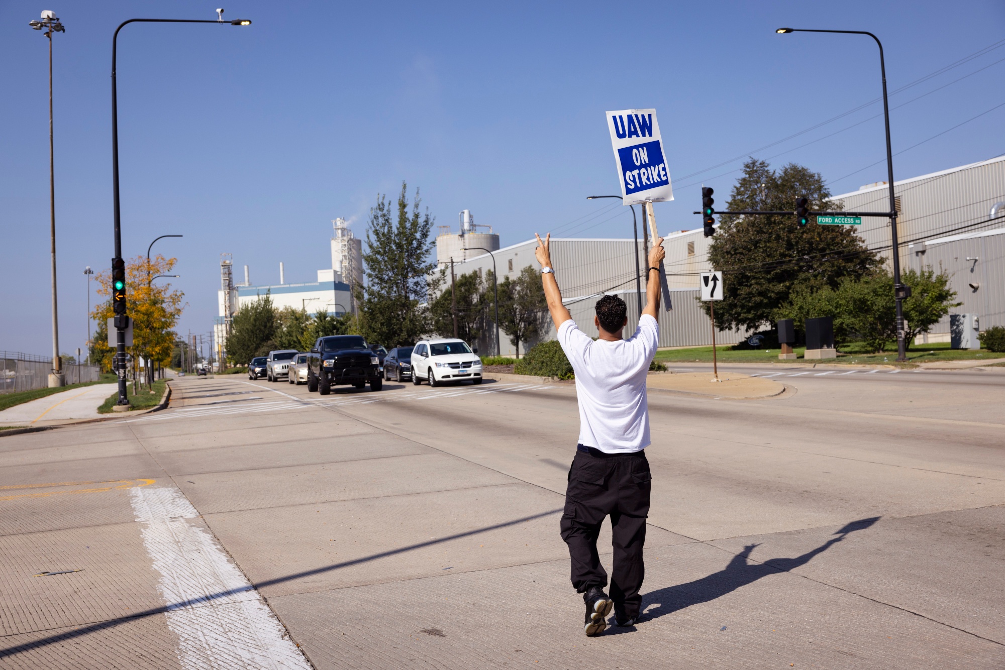 9月30日,联合汽车工人会员在福特芝加哥装配厂外举行罢工。摄影师:泰勒·格拉斯科克/彭博社通用汽车向联合汽车工人工会提出了第六份合同提议,据知情人士称,在某些谈判方面并未超过竞争对手福特和斯泰兰蒂斯所提供的内容。联合汽车工人工会主席肖恩·费恩将于周五宣布工会是否会扩大对这三家汽车制造商的罢工。