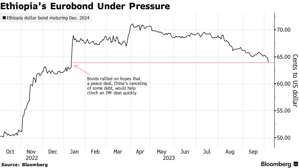 摄影师:Eduardo Soteras/AFP/Getty Images埃塞俄比亚唯一的欧元债券接近抹去自和平进程开始结束其灾难性内战以来取得的收益,因为投资者增加了对这个非洲之角国家违约的押注。