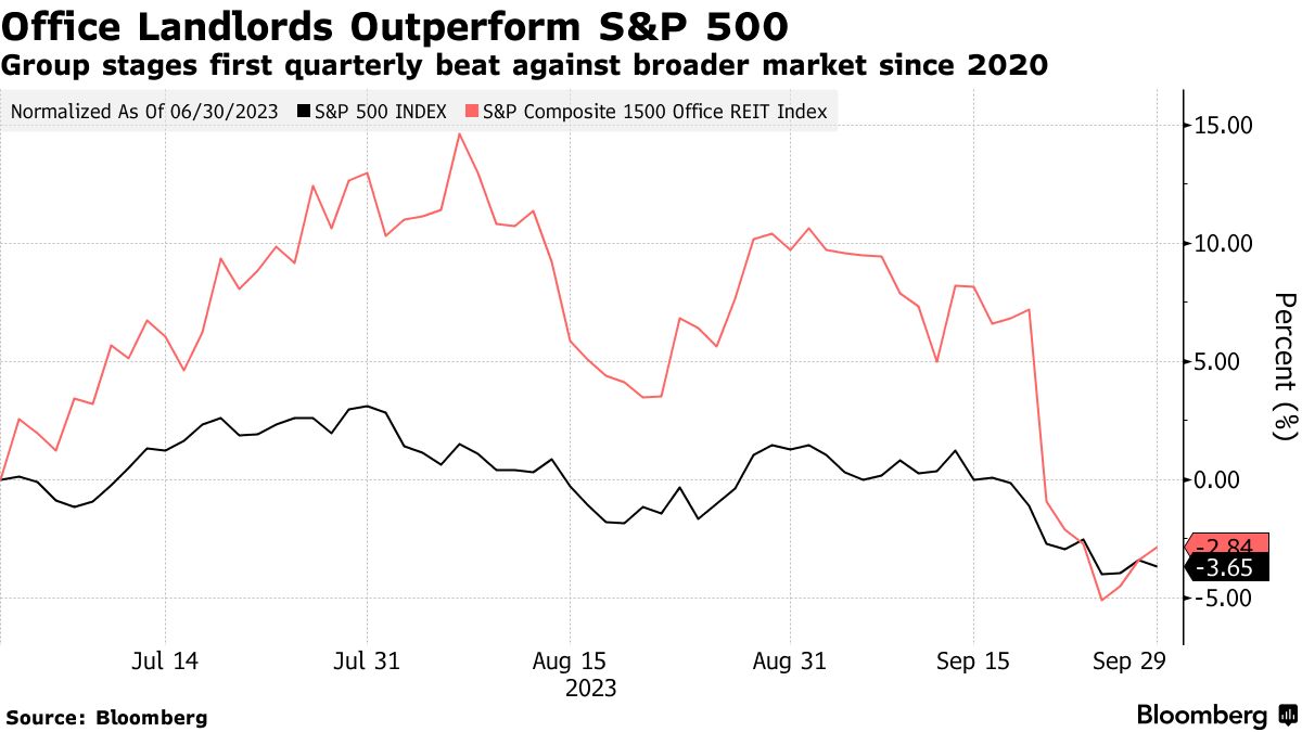 出人意料的是,房地产行业中最薄弱的环节在第三季度表现出相对亮眼的一面。办公室业主在自2020年以来首次在季度表现上超过了S&P 500指数。与S&P 500季度下跌近3.7%相比,该集团第三季度仅下跌了2.8%。