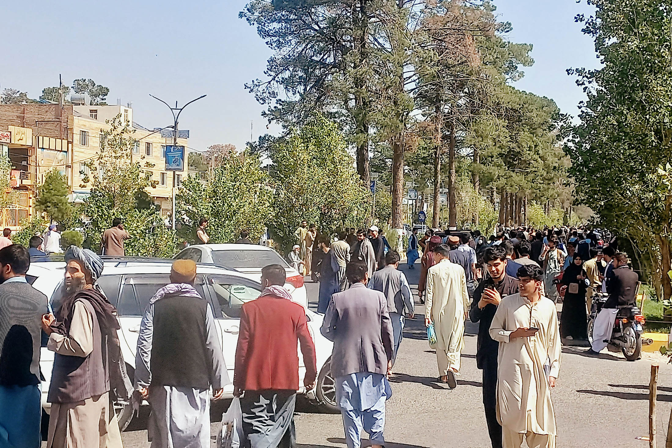 人们在阿富汗赫拉特发生6.3级地震后聚集在街头,日期为10月7日。