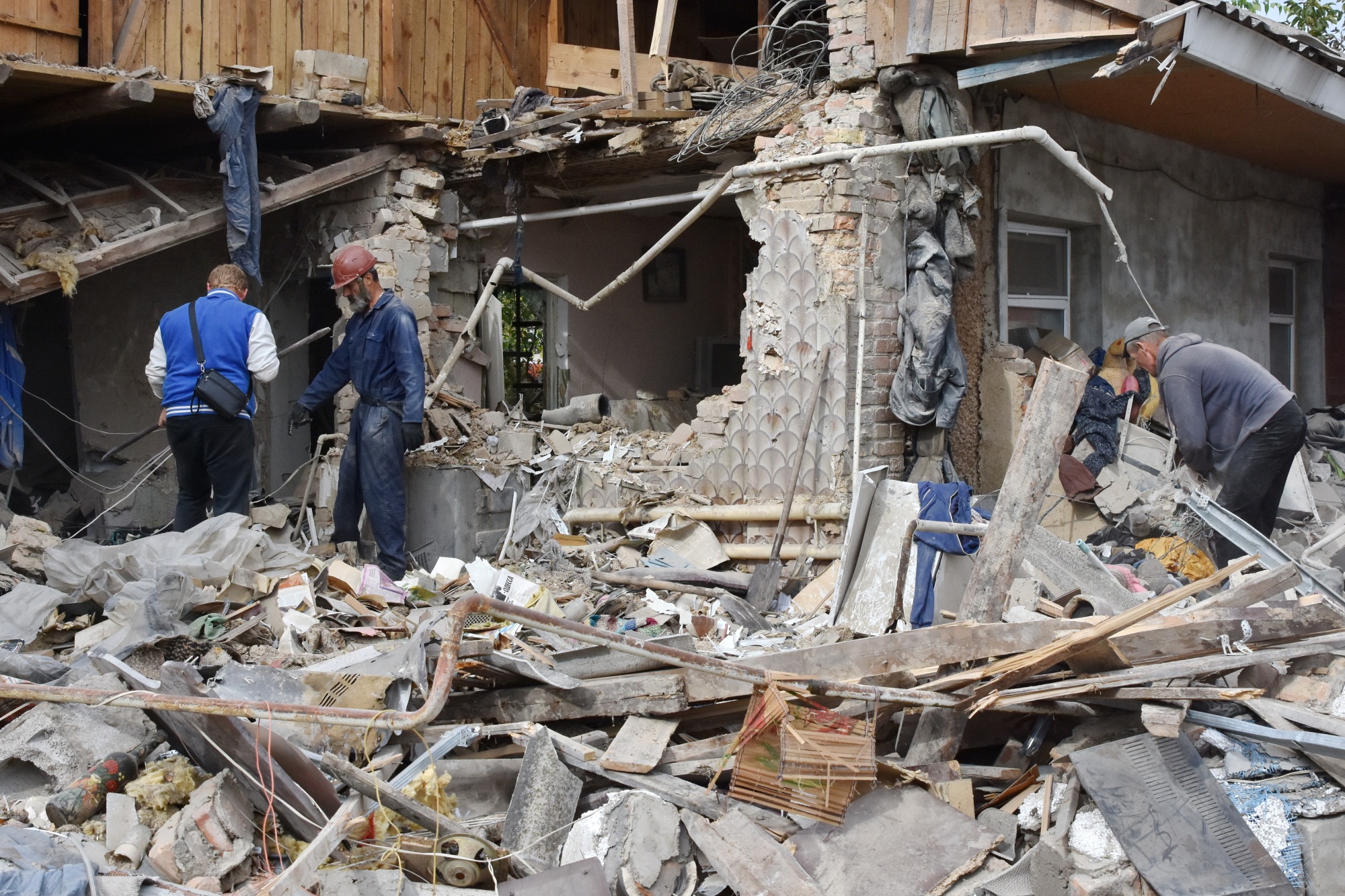 俄罗斯炮击后,村庄比连克清理瓦砾,10月7日。