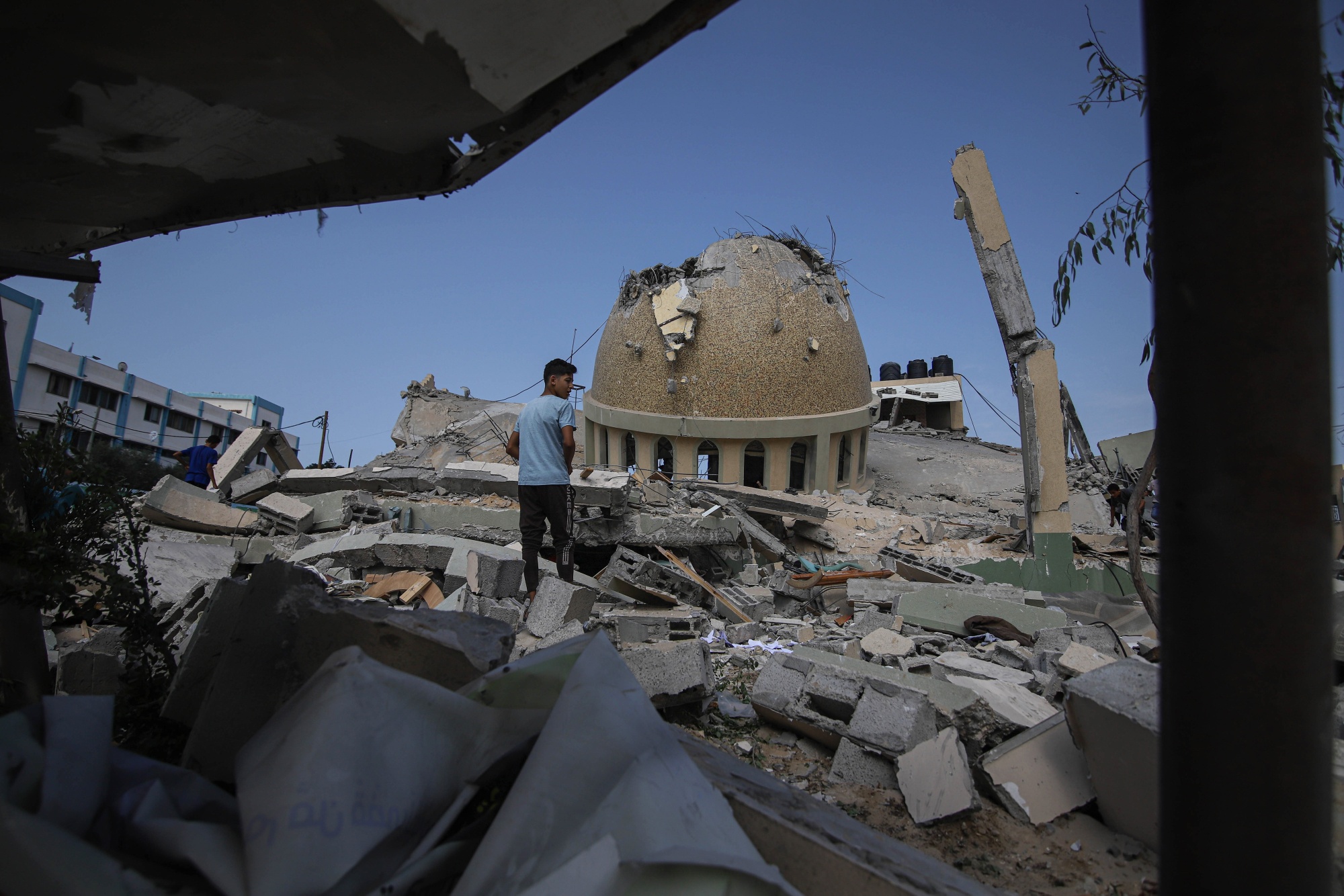 星期日,加沙地带汉尤尼斯遭以色列空袭摧毁的清真寺遗址上的一个男孩。摄影师:Ahmad Salem/Bloomberg希望与以色列正常化关系并和平共处的国家,沙特阿拉伯绝对是其中之一,”他在联合国安理会就该问题举行闭门会议前对记者说。