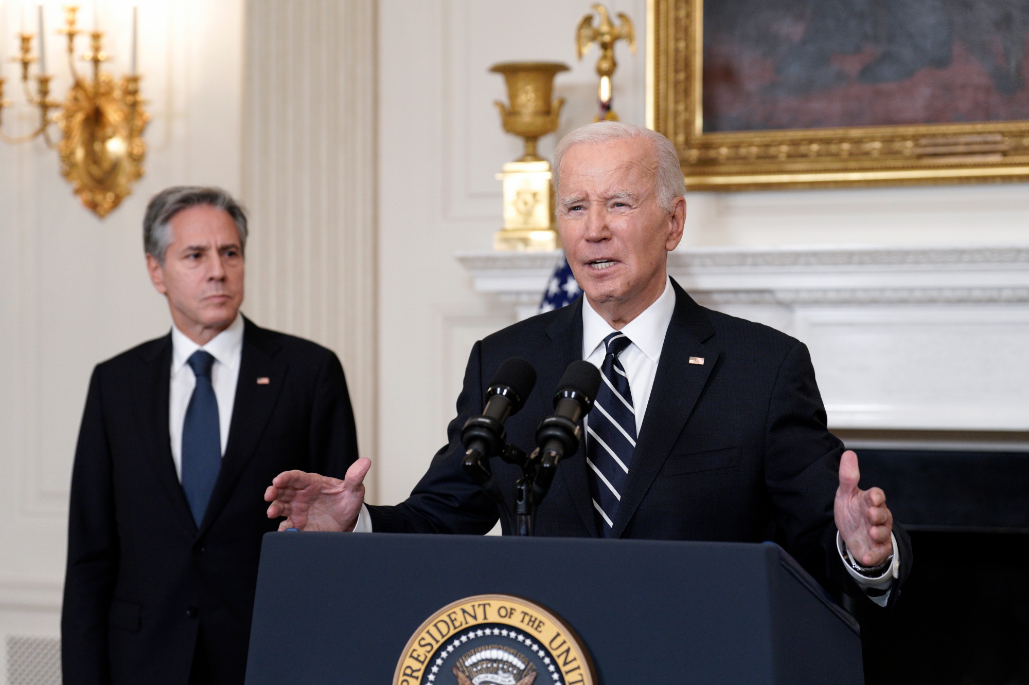 布林肯与总统乔·拜登于10月7日在白宫合影。摄影师:尤里·格里帕斯/阿巴卡/彭博社拜登周六表示,他已明确向以色列总理本雅明·内塔尼亚胡表示,美国准备“提供一切适当的支持手段”给以色列政府和人民。