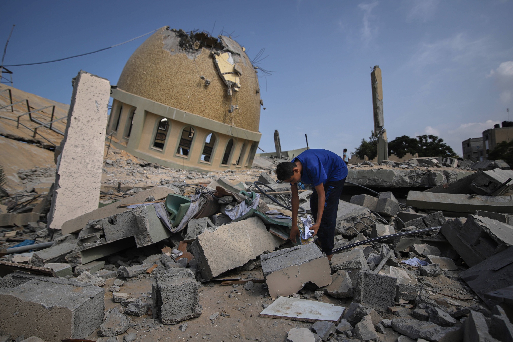 当地一名男孩在加沙汗尤尼斯一座被以色列空袭摧毁的清真寺废墟中搜寻。摄影师:Ahmad Salem/Bloomberg然而,国家的整体情绪在一件事上是团结的:以色列必须全力以赴地驱逐哈马斯在南部的行动人员,并削弱加沙内部的组织。