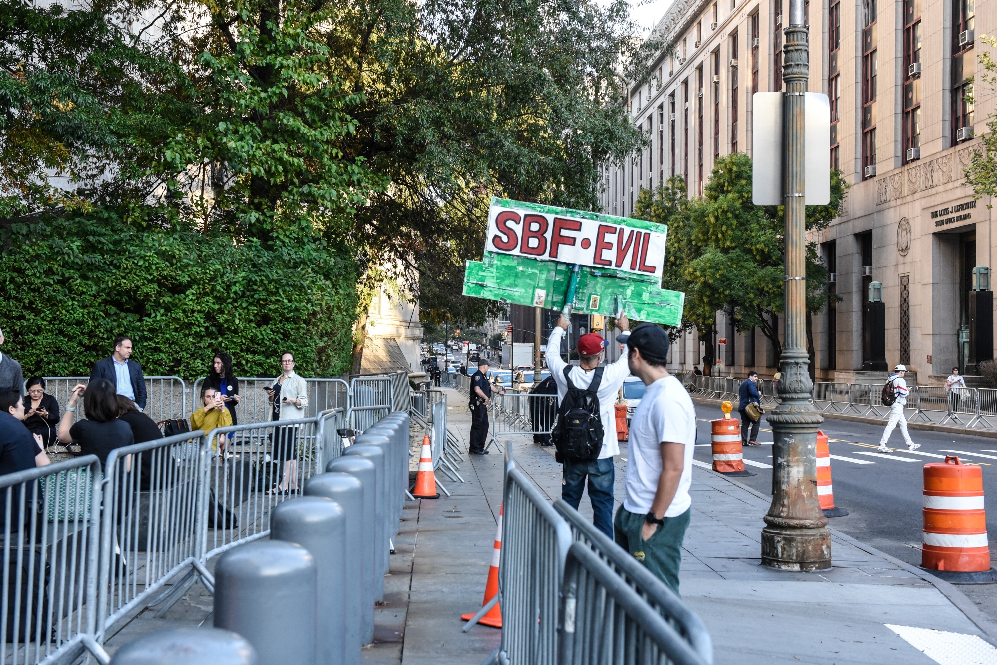 一名示威者在纽约法院外举着一块写着“SBF邪恶”的牌子。