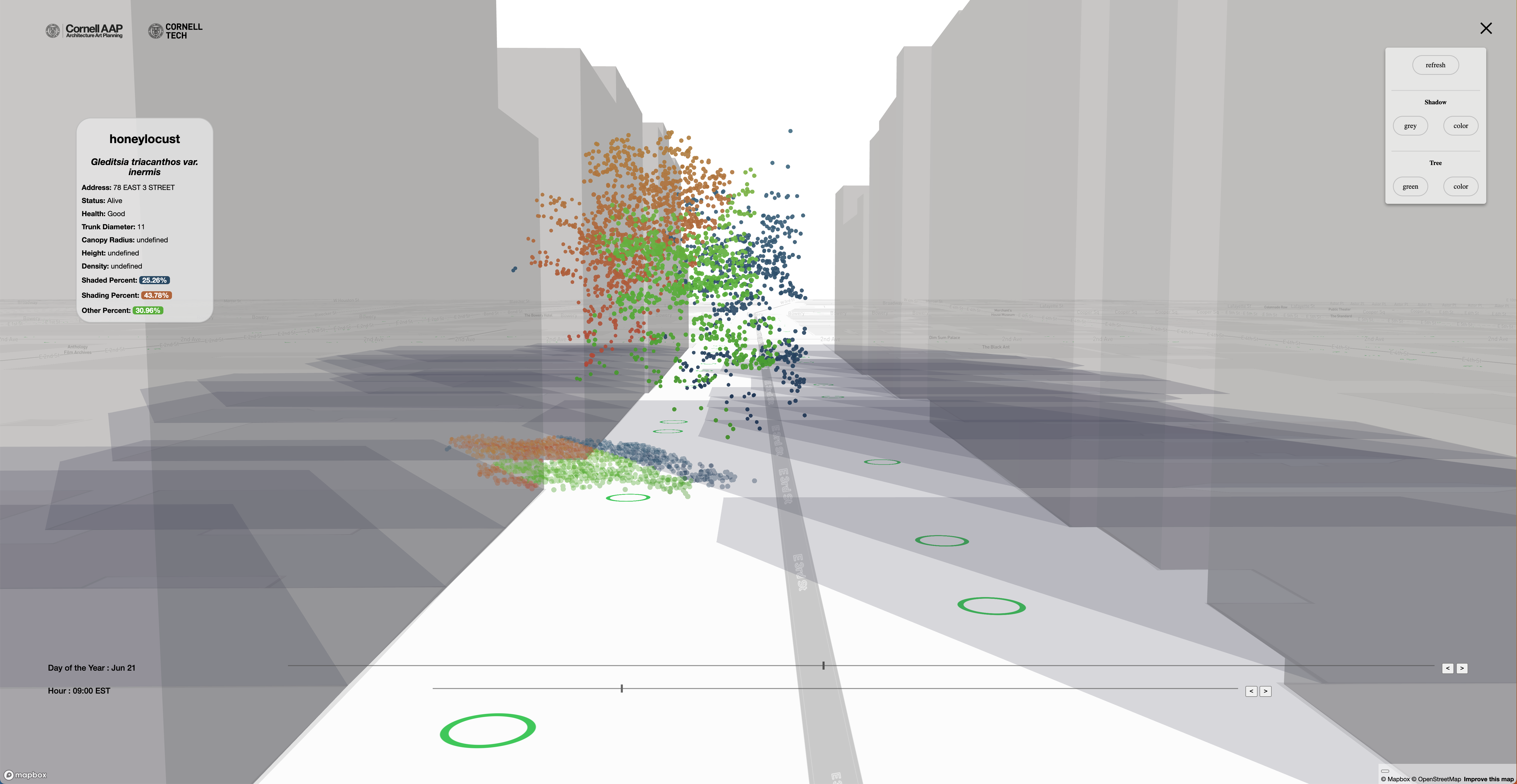 在康奈尔大学跨尺度设计实验室的工作中,我们正在构建工具,以更好地理解和量化城市树木的当地影响。Tree Folio NYC是纽约市树冠的数字孪生体,与康奈尔科技园区的Jacobs城市科技中心合作建立:它从高分辨率的公共数据库中提取城市树木的三维模型LiDAR扫描,模拟它们的当地遮荫环境,并量化它们提供的遮荫量和质量。