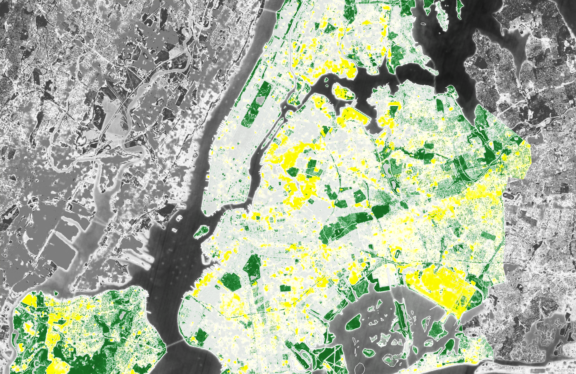 纽约市树冠的整体地图显示了公园和住宅区域中更多树叶茂盛的区域。康奈尔AAP提供这一工具的力量在于它能够提供每棵城市树木对其周边社区的贡献的详细模拟。热量脆弱性是一个全市性问题,但在当地得到体现。空调的使用、建筑通风和遮荫的可获得性都是个体对高温脆弱性的因素。城市树木应被视为分布式遮荫基础设施的一部分。获得遮荫取决于社区中树木的数量以及这些树木能够提供的遮荫质量 —— 这一因素不仅取决于树木的大小,还取决于树木与其当地环境的关系,包括街道的朝向和相邻建筑物的大小。