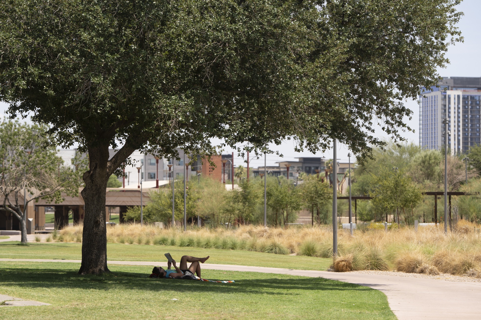 在七月份,菲尼克斯的玛格丽特·T·汉斯公园中的阴影是珍贵的。