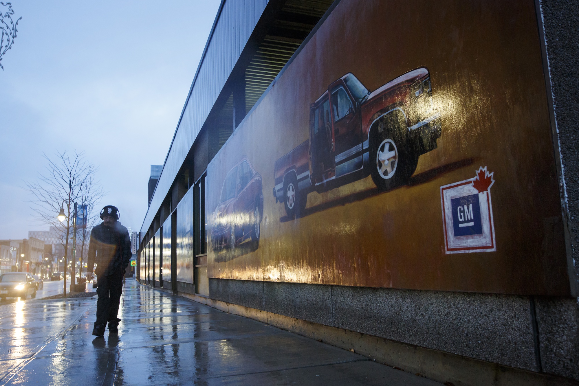 安大略省奥沙瓦的通用汽车壁画。摄影师:Cole Burston/Bloomberg加拿大谈判涵盖了三家通用汽车设施的工人,包括安大略省奥沙瓦的总装厂,生产雪佛兰Silverado皮卡,以及安大略省圣凯瑟琳的动力总成工厂。