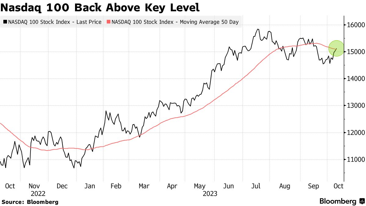 纳斯达克100指数周二上涨了0.6%,这一涨幅使该指数超过了其50日移动平均线。 这是自9月中旬以来首次收于此水平之上,这是短期动量的积极迹象。