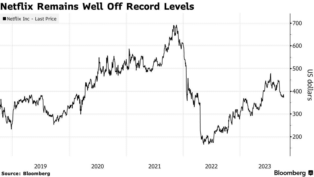 然而,尽管Netflix自去年低点翻倍以上,但其股价仍比2021年的峰值低46%。这种波动形成了与苹果公司或谷歌母公司相对稳健的对比,后者因其盈利和营收流的持久性而备受推崇。尽管过去Netflix曾被随意地与这类股票归为一类,但其波动性反映了投资者在确定其前景方面所面临的困难。