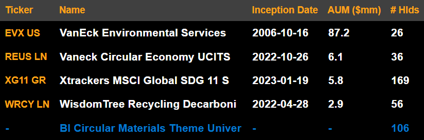 循环材料主题宇宙包括两个部分的106只股票。例如,Fortune Brands Innovations和Commercial Metals(材料)以及GEM和PureCycle Technologies(流程和技术)。