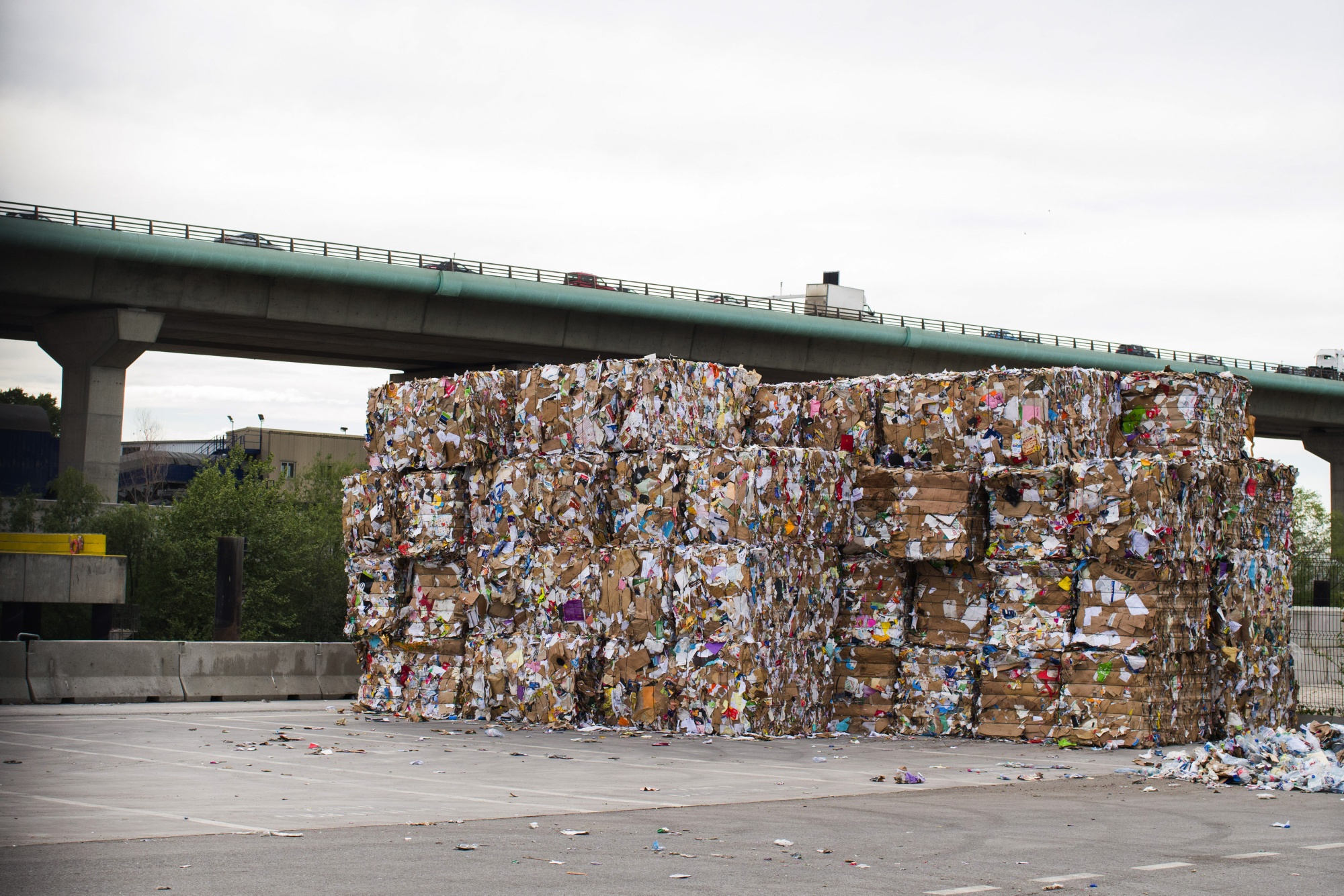 在法国巴黎Gennevilliers区的一个回收和管理站点压缩再生废料。