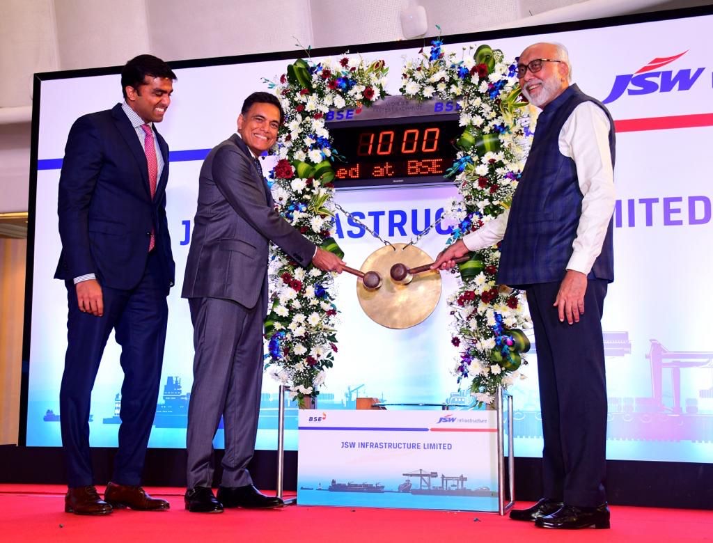 Sajjan Jindal(中)在JSW基础设施上市仪式上。来源:JSW基础设施因此,当我采访港口公司JSW基础设施有限公司的首席执行官阿伦·马赫什瓦里时,我不得不问该集团是否打算像对待塔塔一样对待阿达尼。马赫什瓦里的回答是一句干脆的“无可奉告”。