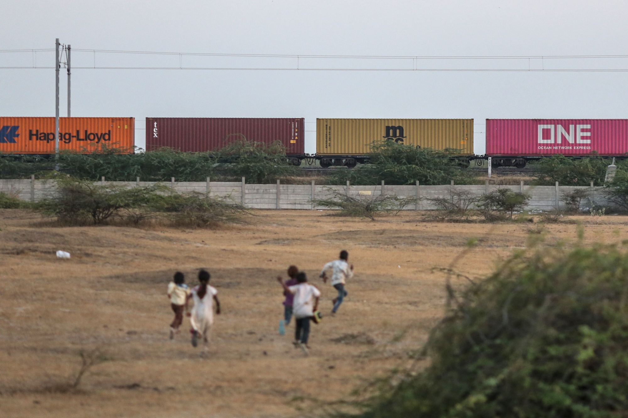 在阿达尼集团的蒙德拉港附近的货运火车。