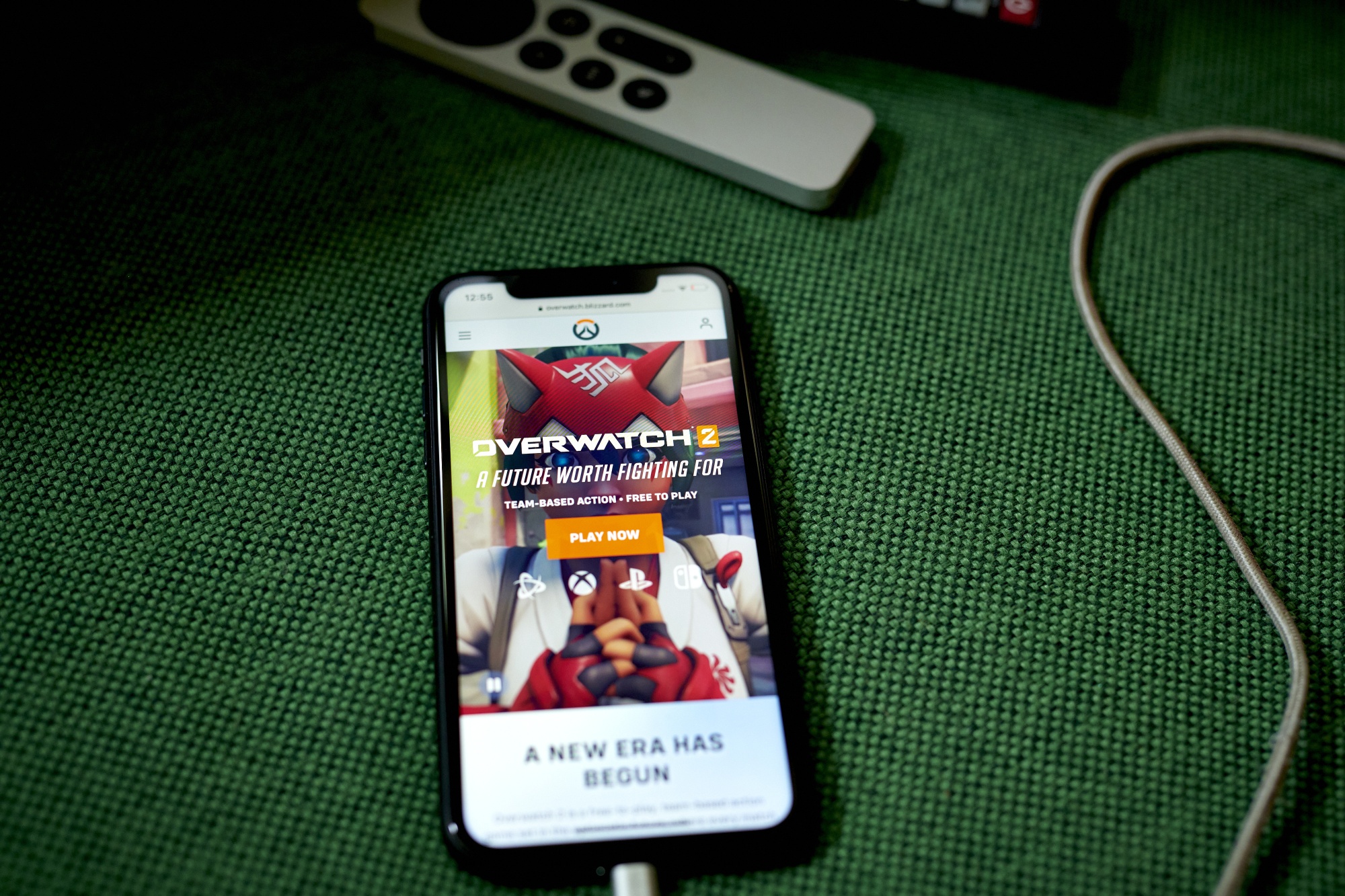 在纽约布鲁克林区排列的手机上的Activision Blizzard Overwatch网站。