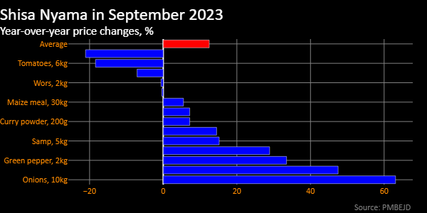 来源:彭博社Celeste Moyanga,在约翰内斯堡的人行道上的烧烤鸡脚摊位上出售烧烤鸡脚,最近不得不从其他街头摊贩那里一两个洋葱,因为新鲜农产品的价格飙升。洋葱的价格在过去一年里飙升了63%,这是彭博的Shisa Nyama指数中任何单一食材涨幅最大的。