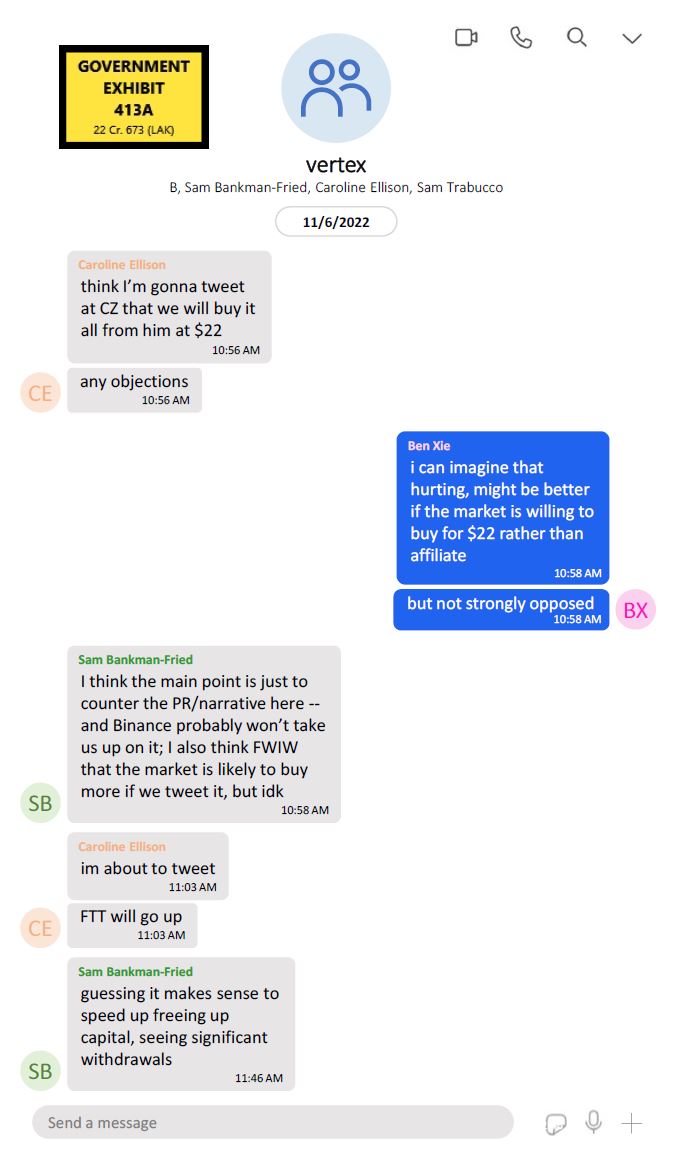 Caroline Ellison和Sam Bankman-Fried之间的文字对话。来源:SDNY美国检察官办公室Sam Bankman-Fried在推特和群聊中的言论被用作对他在历史性欺诈审判中的证据。