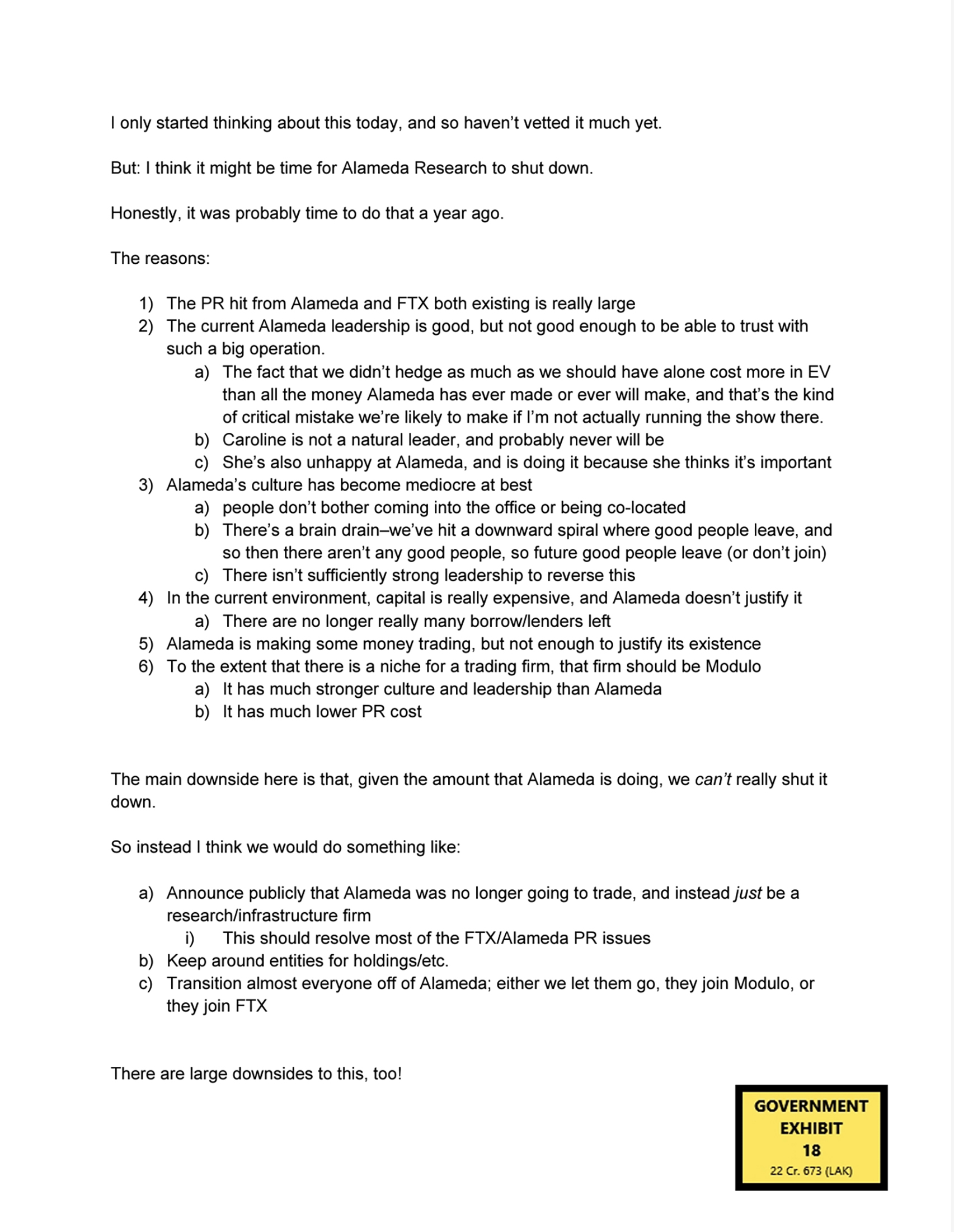 王证实,Bankman-Fried考虑在2022年9月关闭Alameda Research,因为两者之间的利益冲突引起了公众关注。王表示,展示的文件显示了Bankman-Fried的个人备忘录,他最终决定无法关闭对冲基金,因为它已经访问并花费了FTX客户资金的大部分,无法偿还。文件显示,Bankman-Fried充分意识到,如果Alameda和FTX之间错综复杂的关系曝光,将会造成声誉损失。阅读完整的PDF 这里。