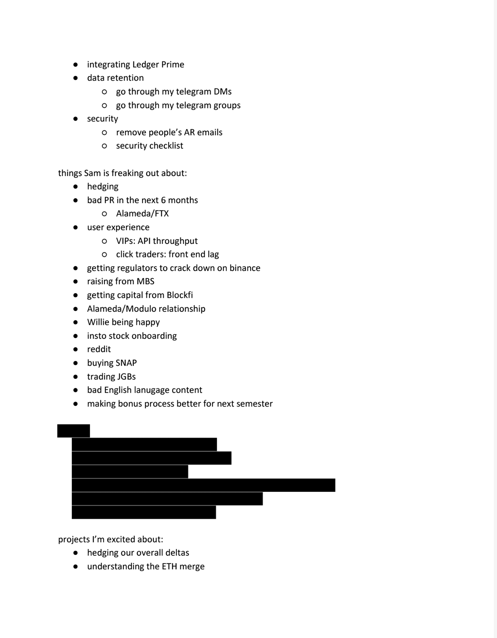 埃里森证实,她在待办事项清单和优先事项上保留了几个Google文档。在下面的展示中,她写道“山姆担心的事情”,包括对冲Alameda的投资组合风险。文件展示了Bankman-Fried对Alameda财务状况的担忧。Bankman-Fried的律师马克·科恩在开场陈述中辩称,Bankman-Fried在Alameda破产几个月前就开始担心加密货币价格的剧烈波动,并敦促埃里森对进一步损失进行对冲,但她没有这样做。列表中的第四项是“让监管机构打击币安”。Bankman-Fried认为,打击币安,即最大的加密货币交易所和FTX的竞争对手,将是FTX获得市场份额的最佳途径,她说。阅读完整的PDF 这里。