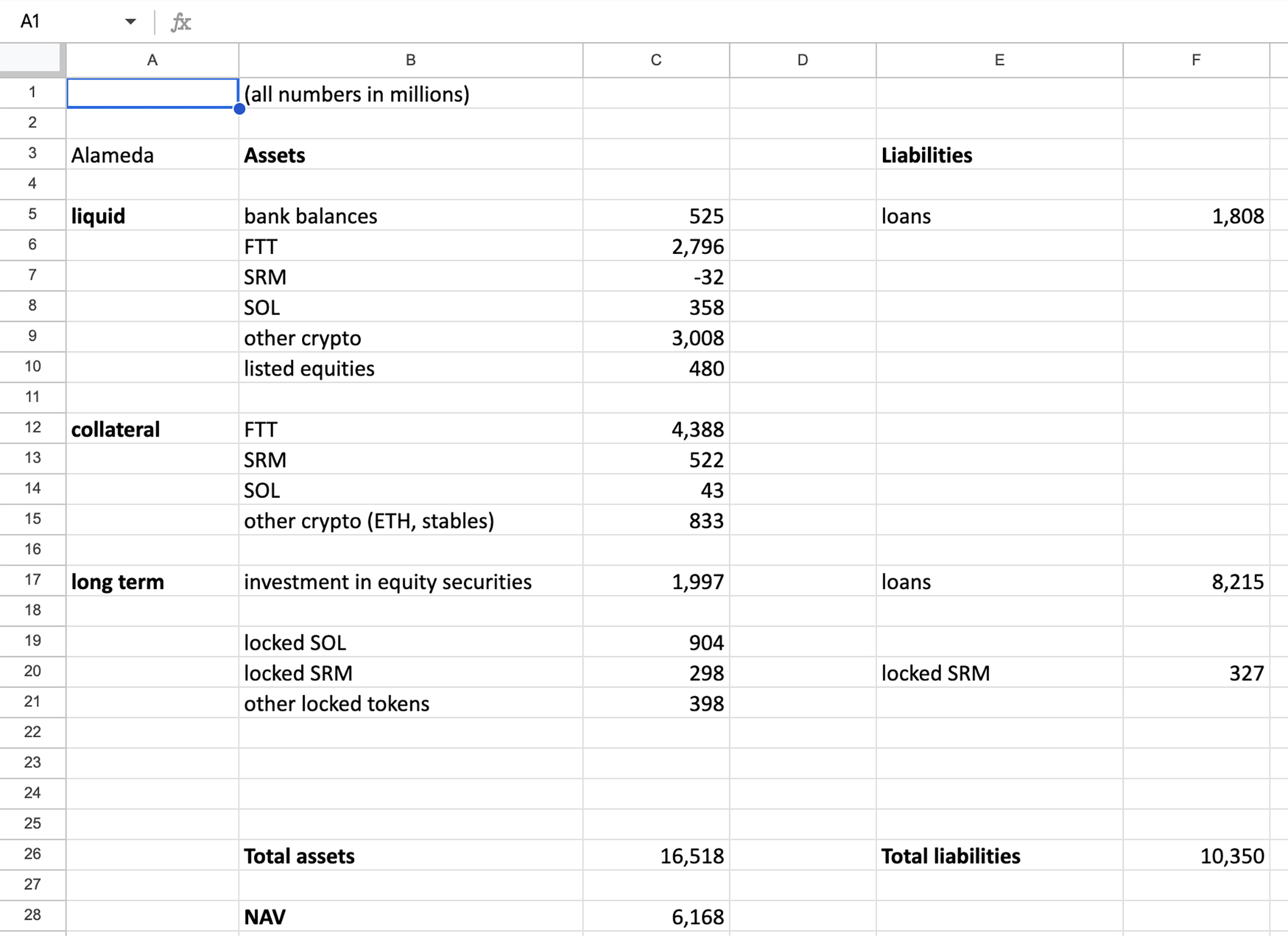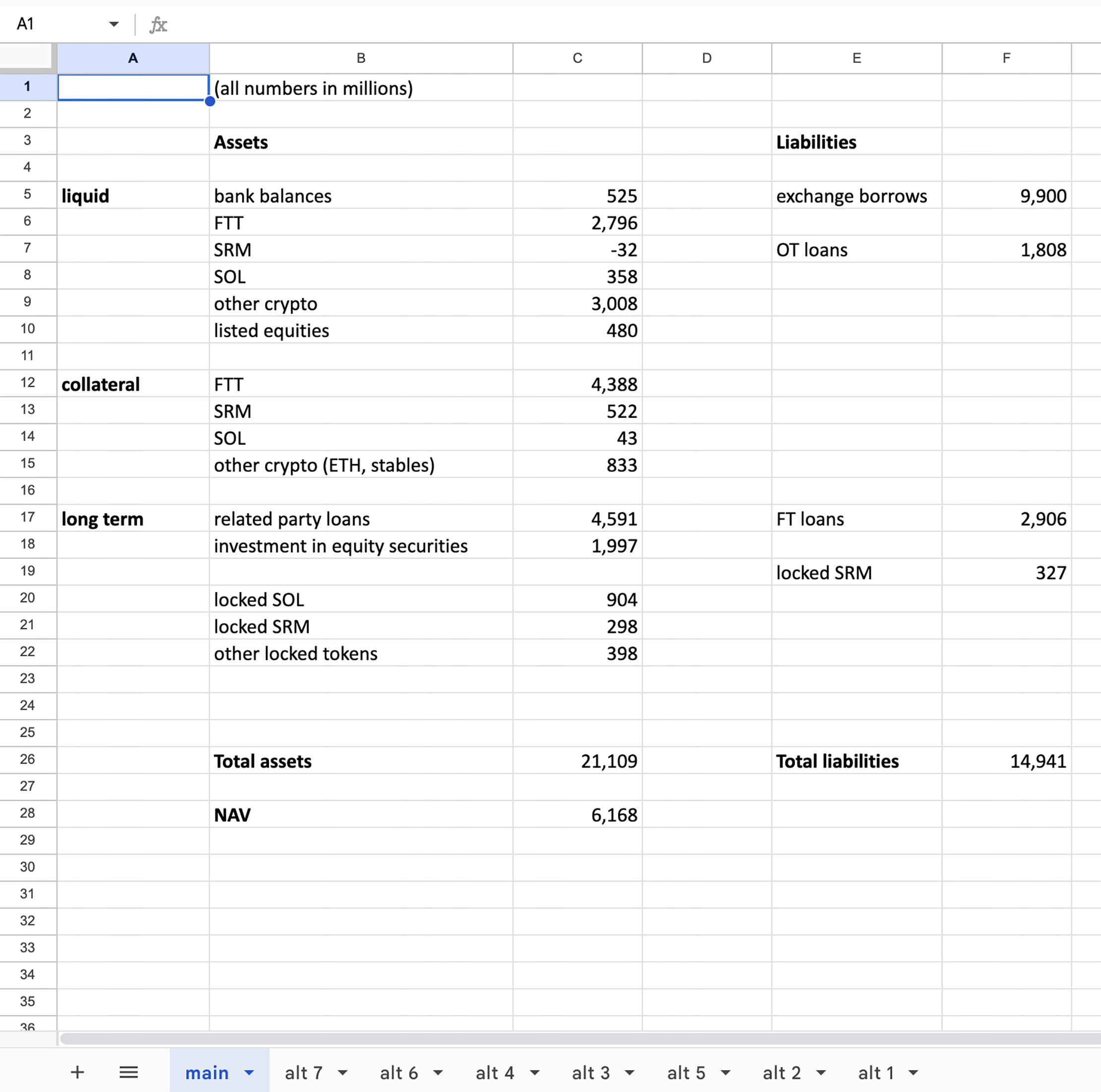 2022年6月,随着加密货币价格的螺旋式上升,Alameda的贷款人开始追讨债务。埃里森表示,Bankman-Fried指示她准备“替代性”资产负债表,以回应其中一家贷款人Genesis要求提供财务信息的请求。“我理解他指示我想出方法来掩盖我们的资产负债表中看起来不好的事情,”她作证说。她想出了七种潜在版本,而Bankman-Fried选择了“Alt 7”,这将掩盖Alameda向FTX客户大量借款的事实。这些展示文件显示了主要资产负债表以及每个替代方案的七个额外选项卡。