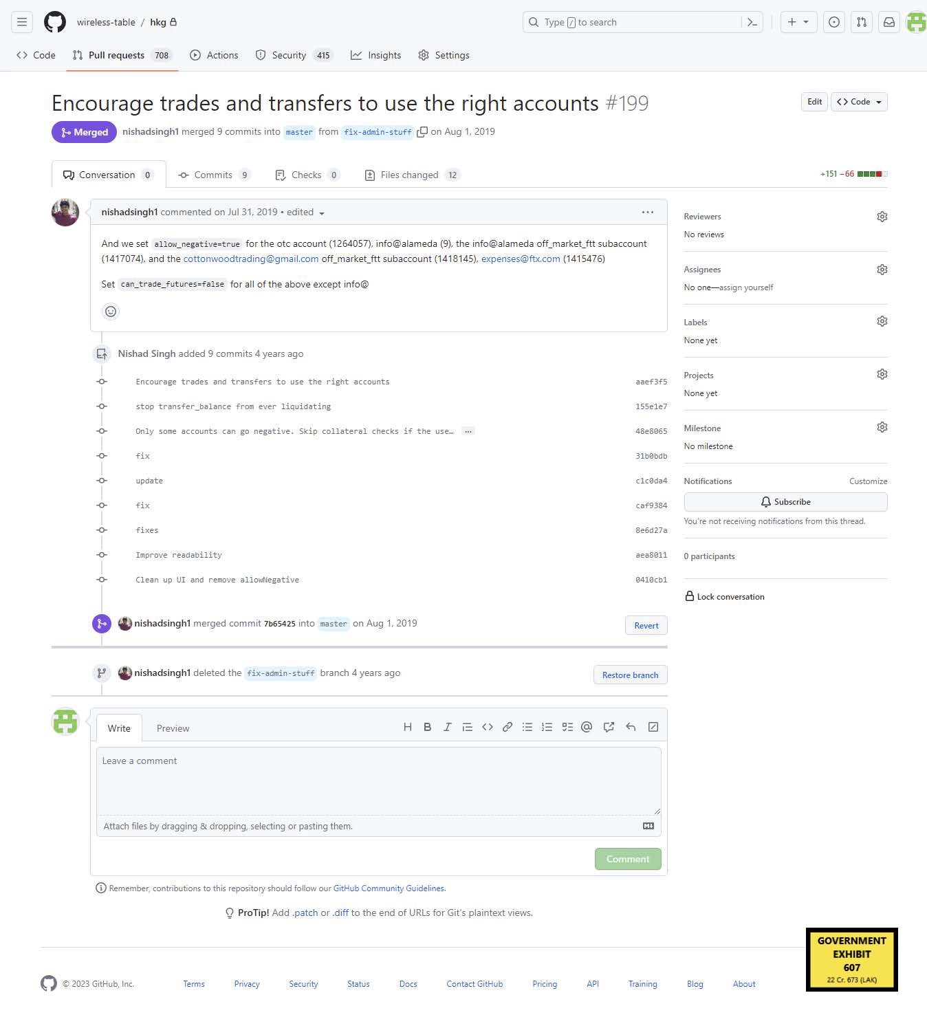 FTX 代码由王刚制作来源:SDNY美国检察官办公室此外,曾与班克曼-弗里德一起在麻省理工学院就读的王刚作证称,他的老朋友曾要求为Alameda添加一个“允许负余额”功能,另一位前FTX高管尼沙德·辛格实施了代码更改。这使得Alameda可以提取比实际拥有的资金更多的资金,这是其挪用FTX客户资金的一种方式。下面的展示显示,这一功能是在2019年7月添加的 —— 这仅仅是FTX成立几个月后。