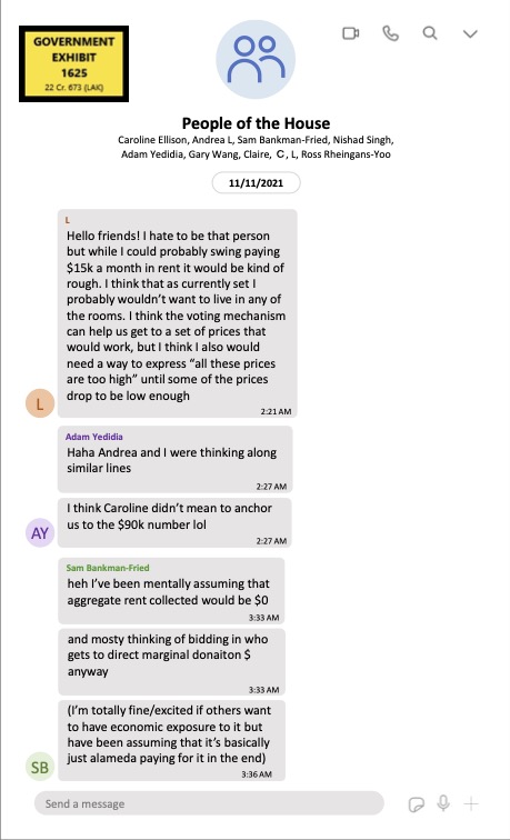 耶迪迪亚说,包括班克曼-弗里德、埃里森、王和辛格在内的10人共同居住,并分享一个名为“房屋人员”的Signal聊天群。展品显示,当耶迪迪亚和其他人对租金提出担忧时,班克曼-弗里德回答说,他一直“假设最终基本上是阿拉米达支付”。这一回应直指控方的案件核心,即班克曼-弗里德在利用阿拉米达的资金——从FTX客户资金挪用而来——资助他奢华的生活方式。