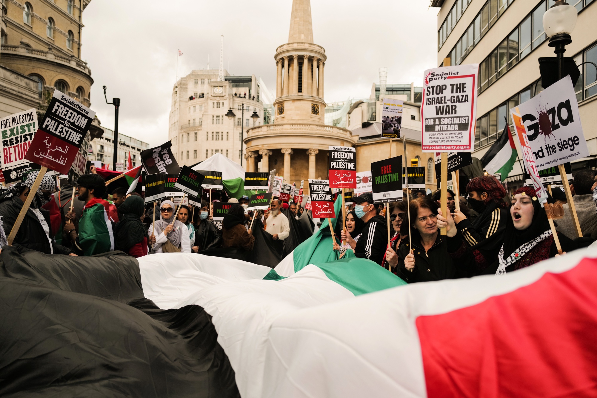 伦敦部署了超过1,000名警察,示威活动仍然保持和平,即使当局威胁要逮捕任何支持哈马斯的示威者。