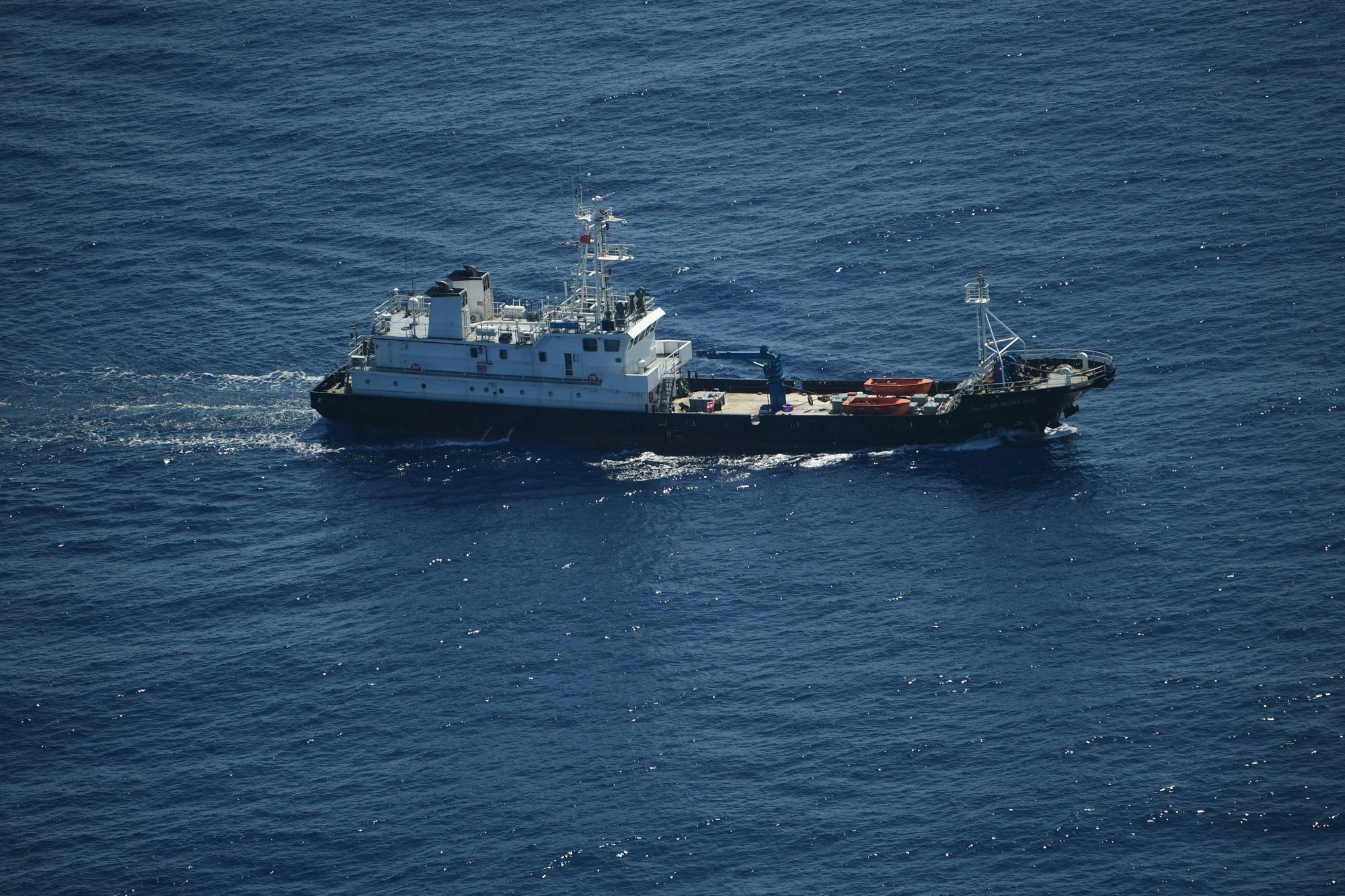 菲律宾渔业与水产资源局在南中国海有争议水域进行海上监视飞行时,一艘中国海军舰艇。